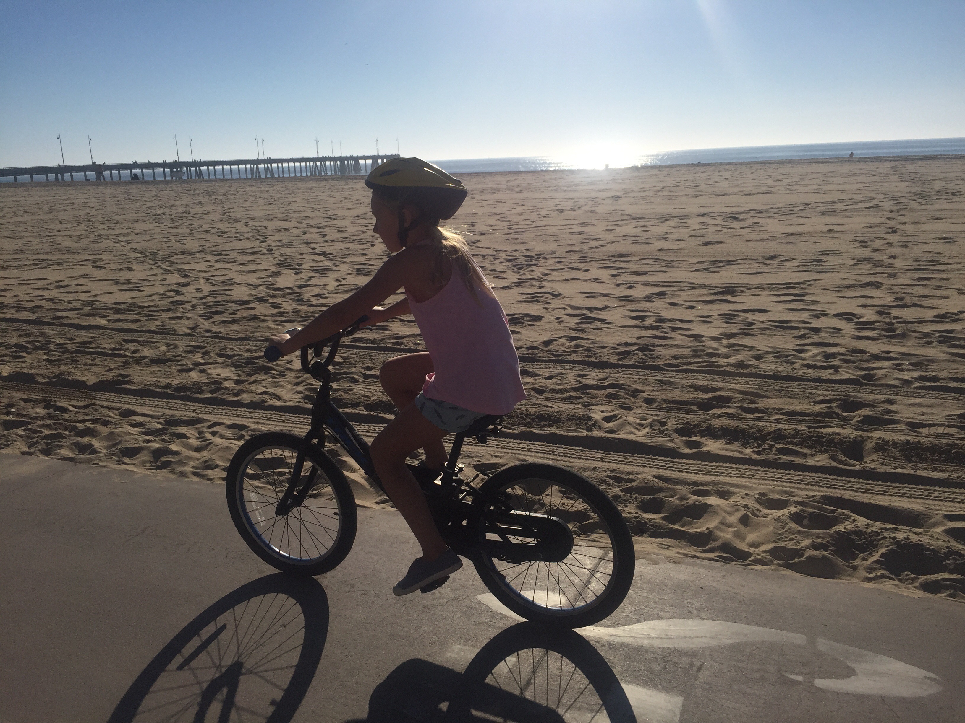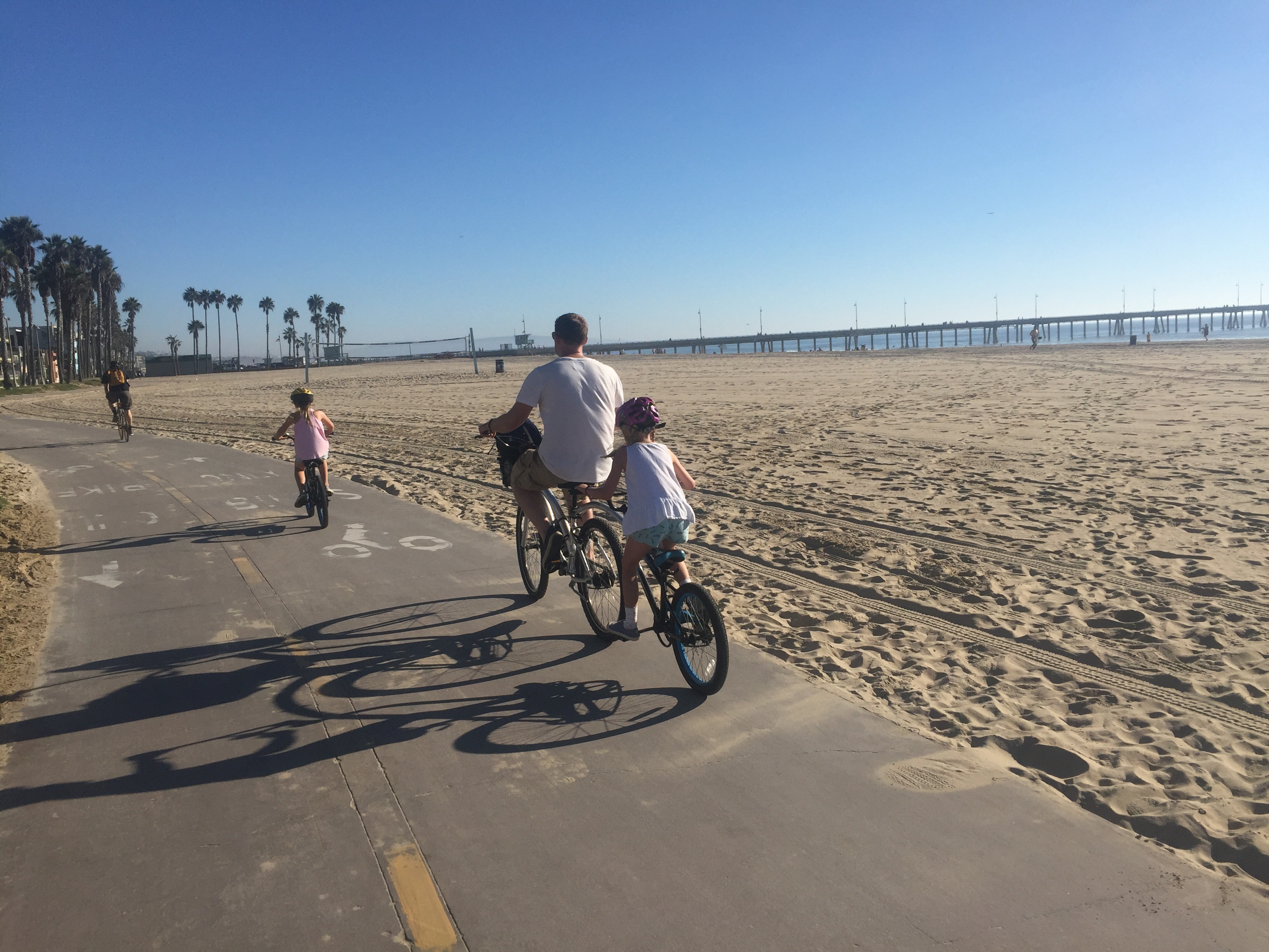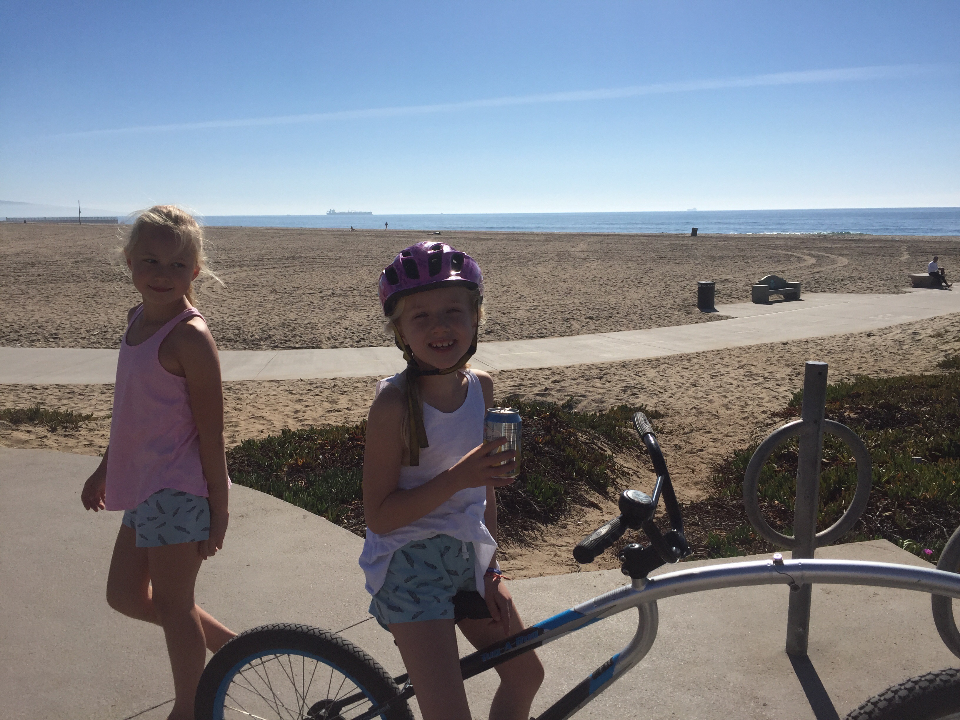 We hired two adult bikes one with a pull along bike for Daisy and a children’s bike for Molly from hermosa cycles shop. We’d packed some homemade lunch and set off in the warm Californian sun.