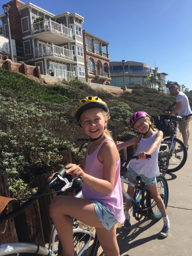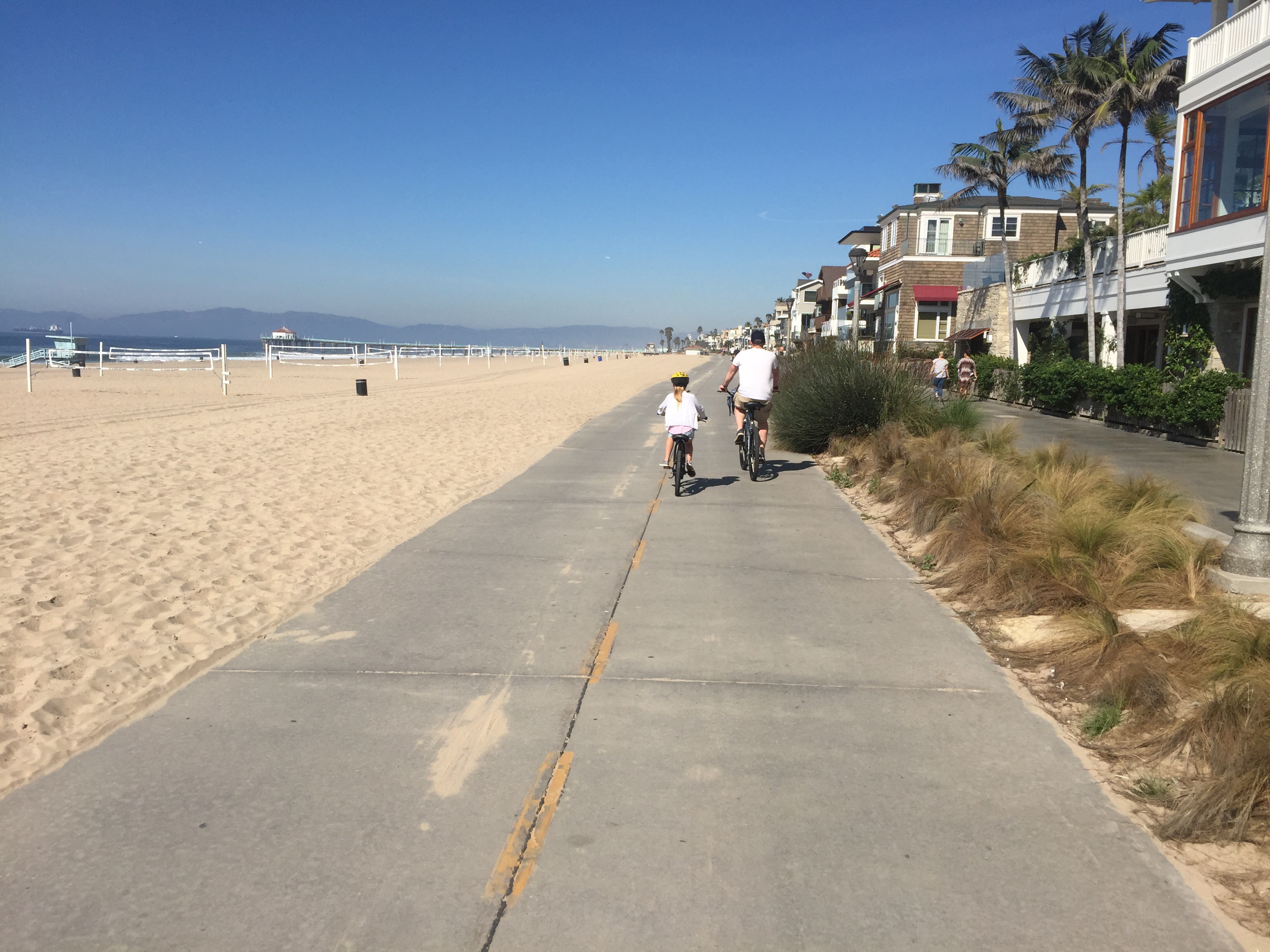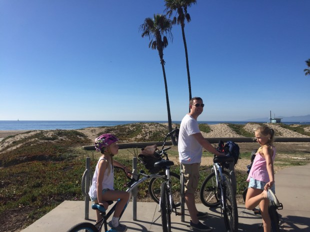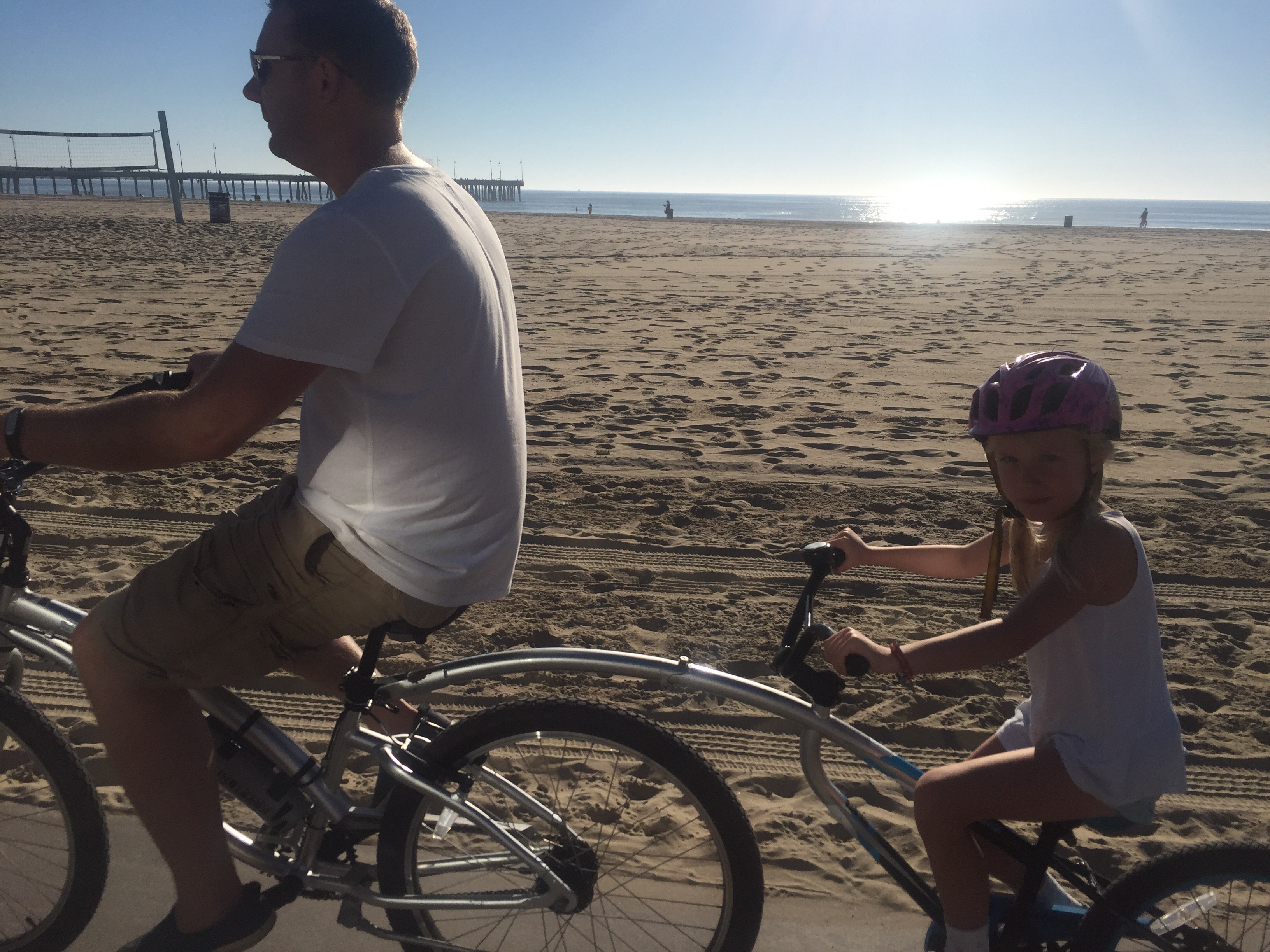 We hired two adult bikes one with a pull along bike for Daisy and a children’s bike for Molly from hermosa cycles shop. We’d packed some homemade lunch and set off in the warm Californian sun.