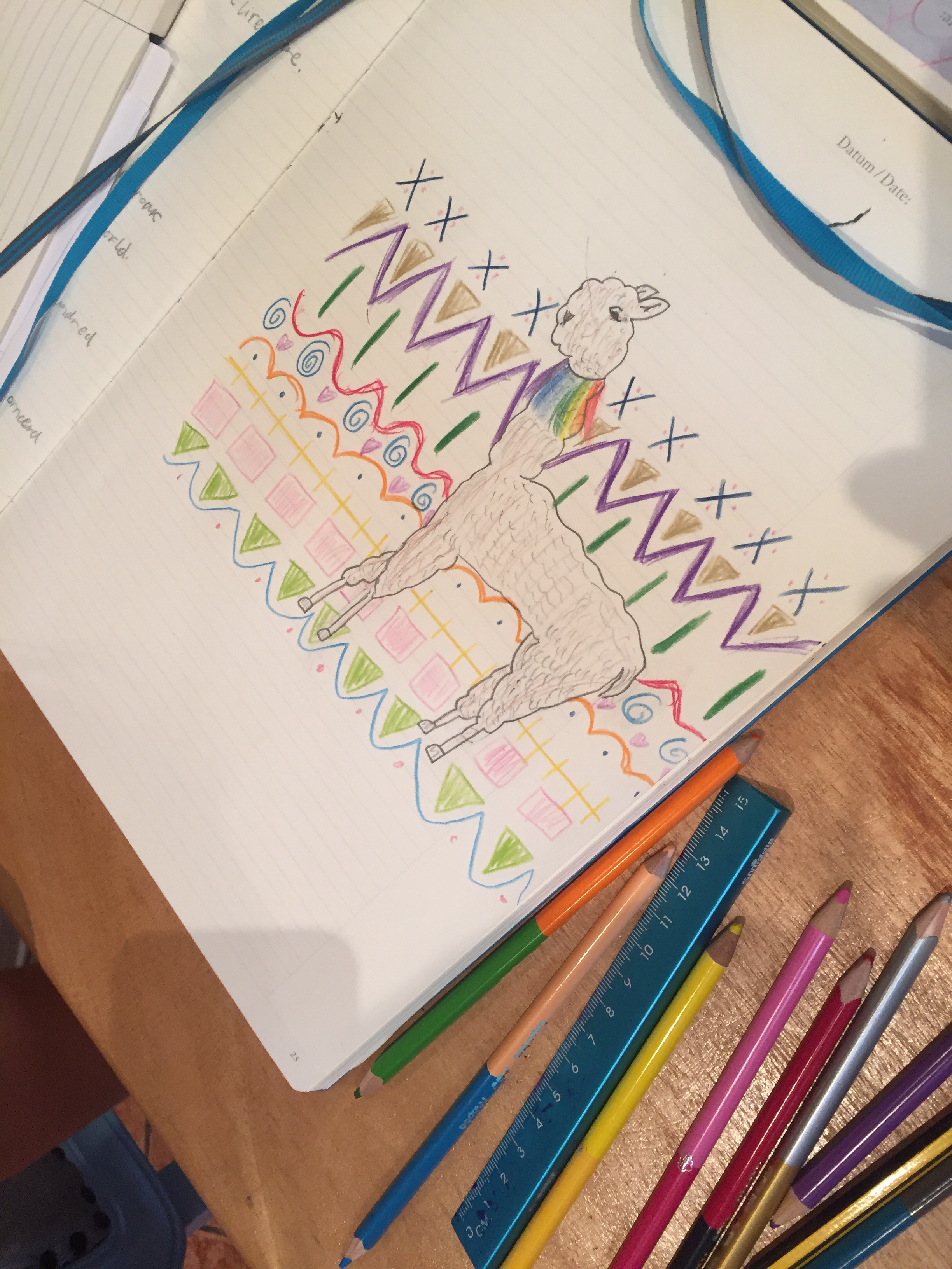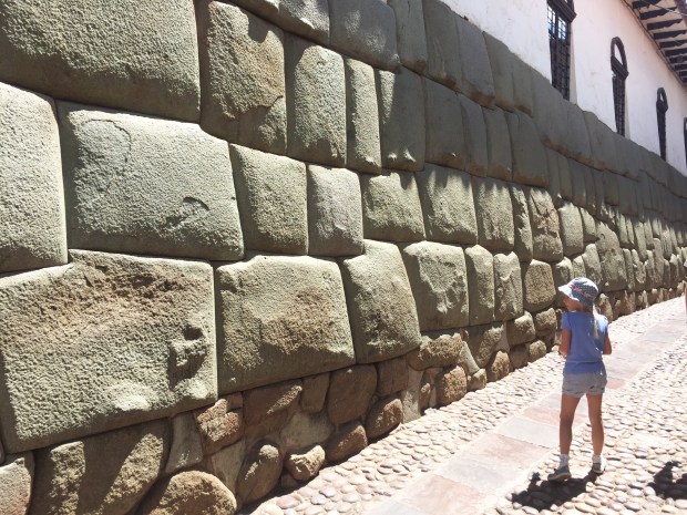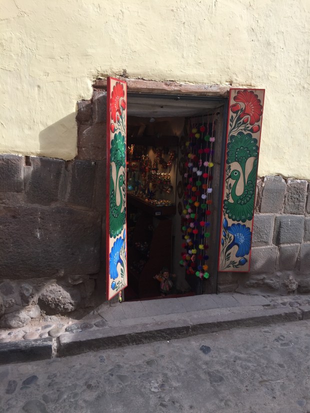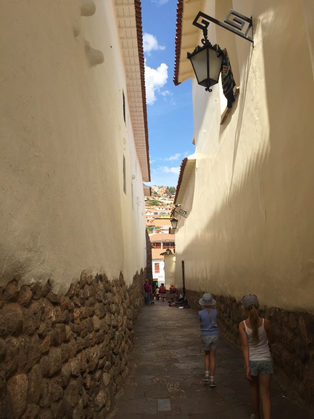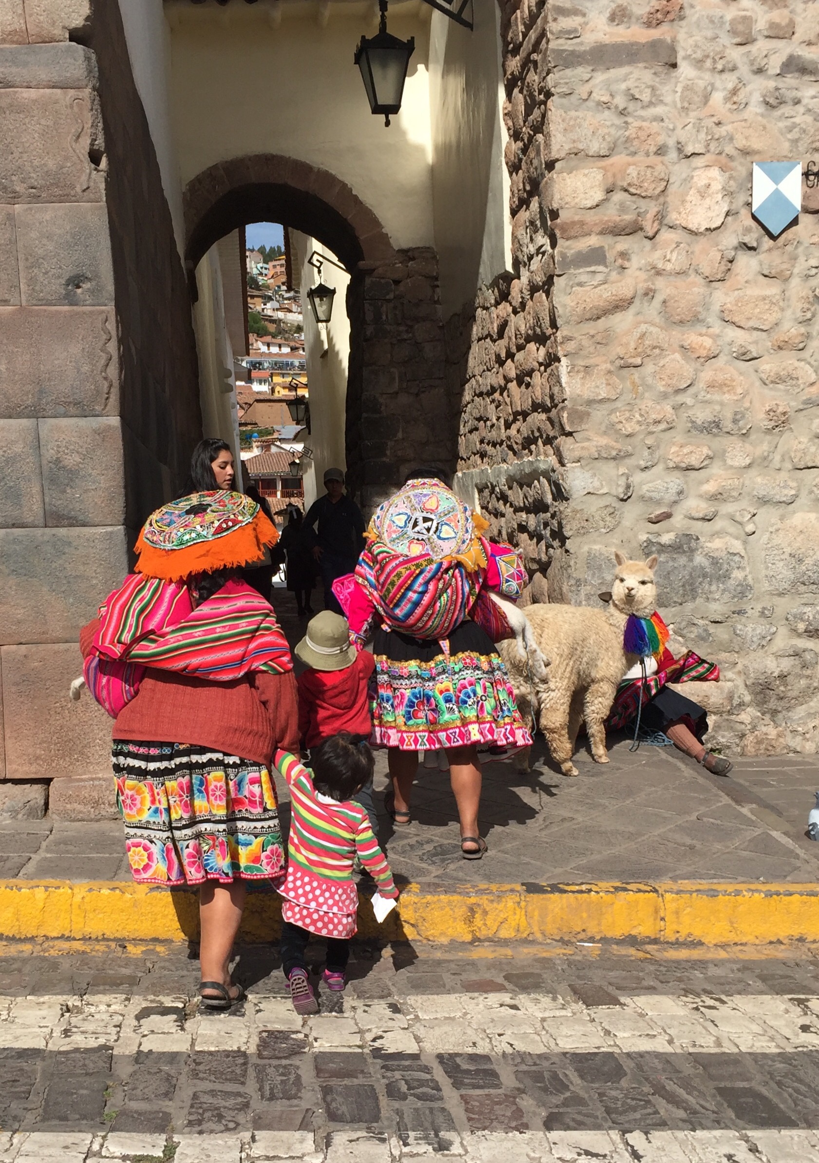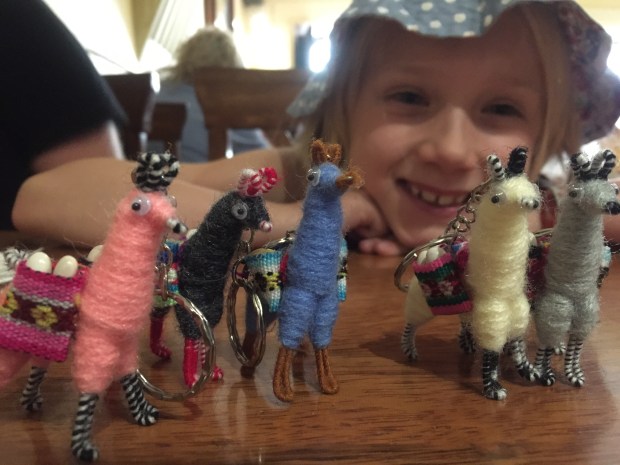We then slowly meandered home. The streets of Cusco are made for wandering around, narrow cobbled streets, red tiled roofs and amazing mountain views. You stumble across inca walls amazingly preserved, little stalls selling beautiful colourful Peruvian goods are slong all the streets and on almost every corner there’s an inca woman in traditional dress holding a baby llama covered in pom-poms trying to get you to pay for a photo! They are pretty cute, the girls and I are pretty smitten, we even did llama artwork when we got home!