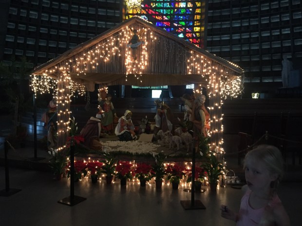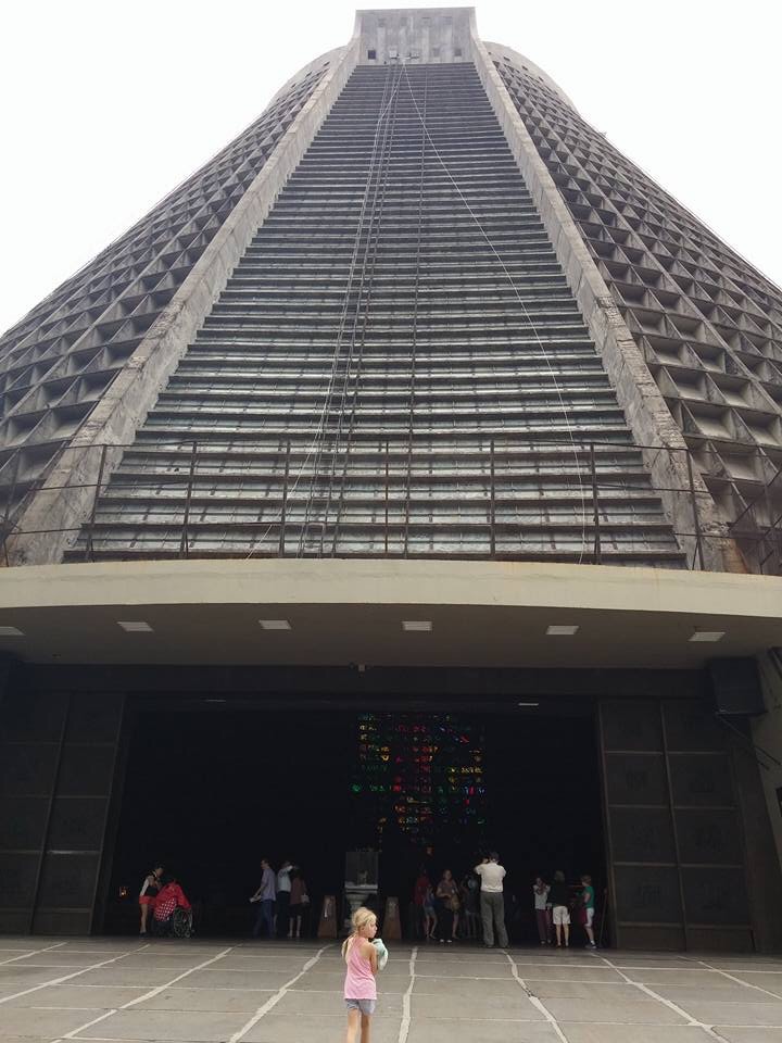 We then traveled through the lively Lapa neighbourhood and dashed into the most unusual cathedral, the cathedral metropolitan, shaped like a pyramid with an internal cross on the roof made of stained glass. Molly’s wasn’t keen but it was interesting to see such a modern take on a cathedral and lovely to see a nativity scene on December 1st!