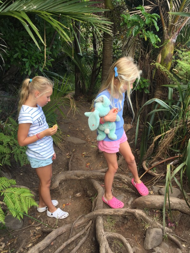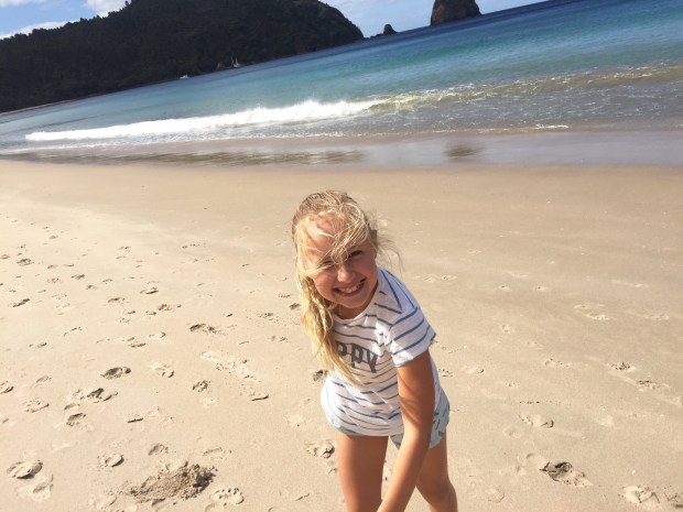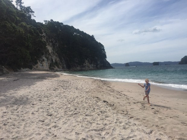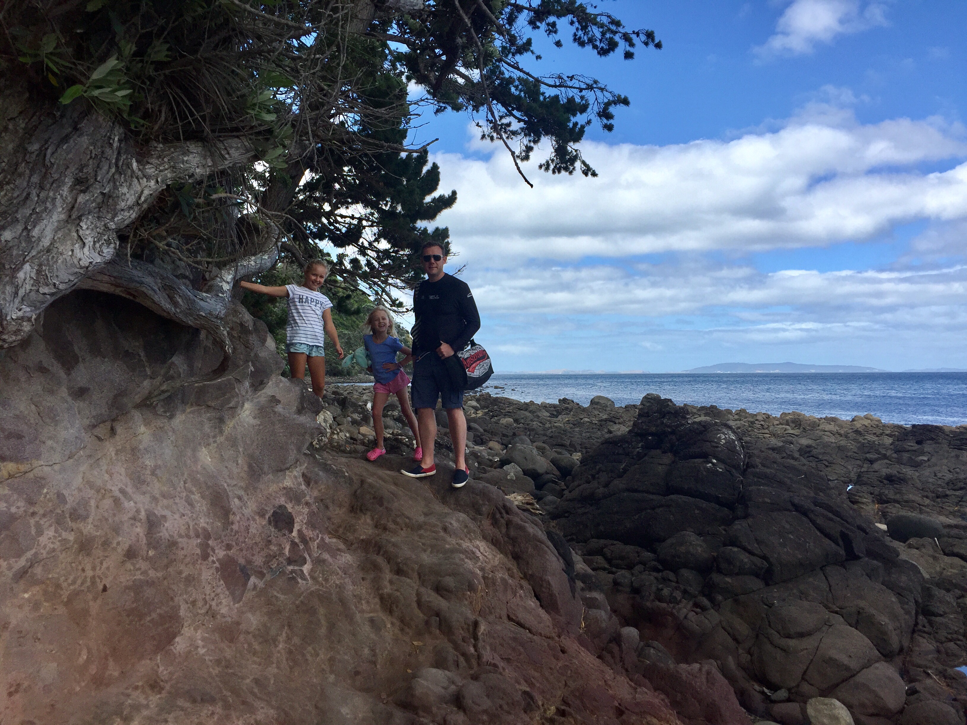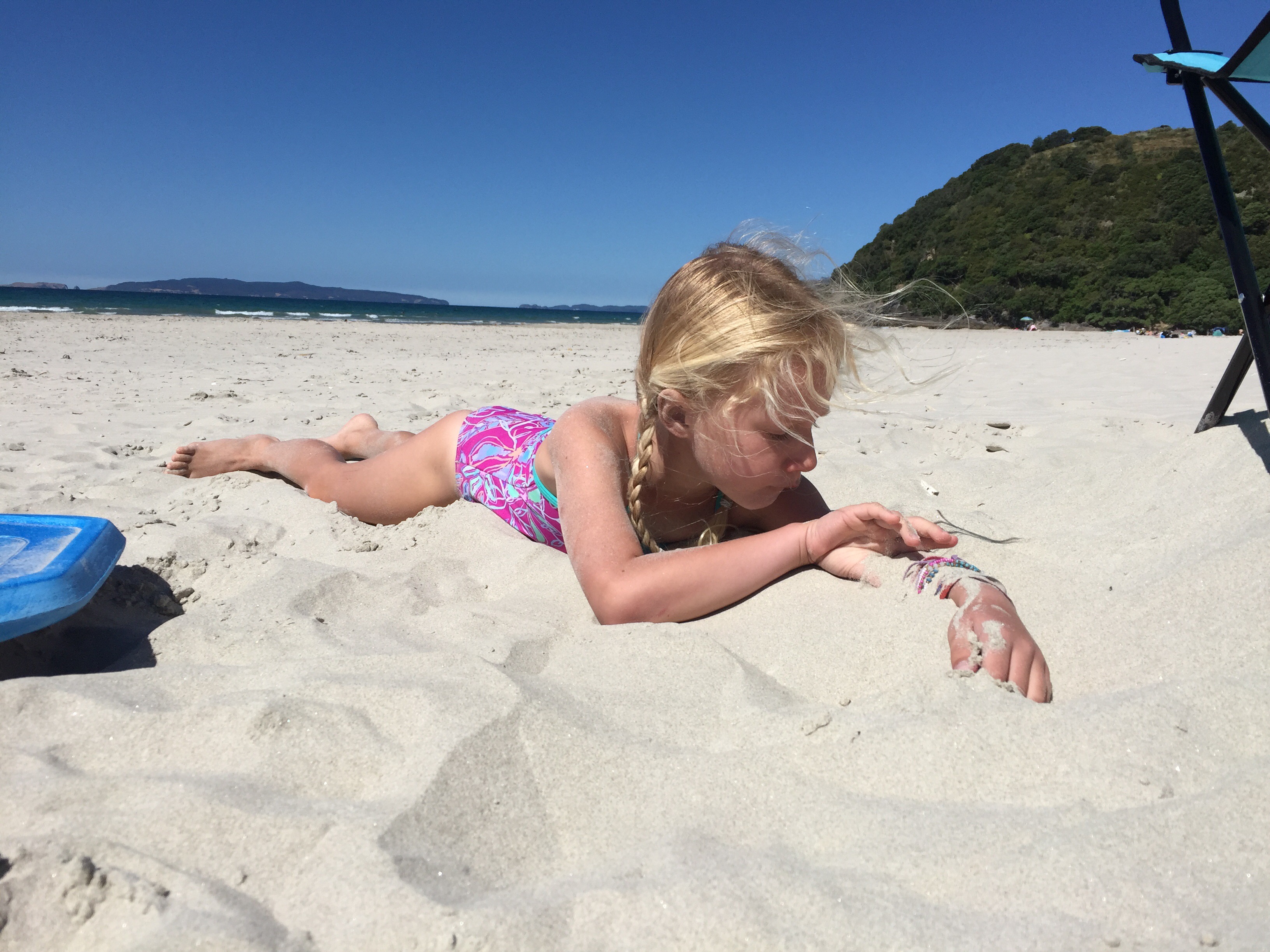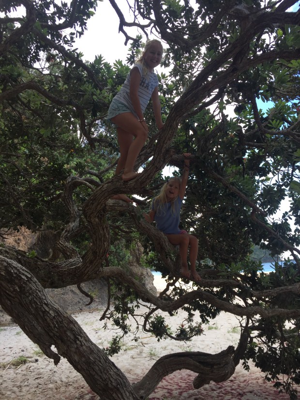 On our second day we decided to find New Chums Beach, now this beach has made its way into the top ten of the beaches in the world list! So we could hardly just drive by! There isn’t really a pathway to the beach and it can only be reached during low tide by scrambling over the rocks, through the bush and around the rocky headland. When we finally made it to the beach after the 30 minute trek we had a perfect golden sweeping beach stretching out in front of us, with a rocky backdrop and little caves for the children to climb in, Pohutukawa trees overhanging to give shade (and the girls to climb in!!!) and gentle lapping waves to splash in! Beautiful! It was a little cloudy and there was a bit of a breeze when we were there but we could all still see why it had found its place on the list!