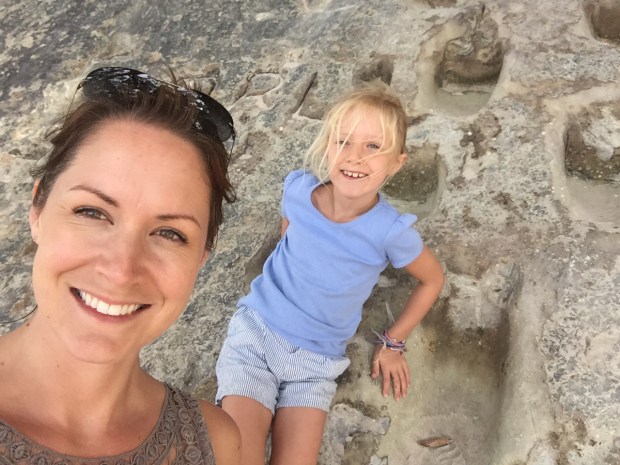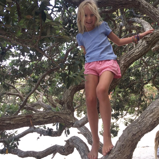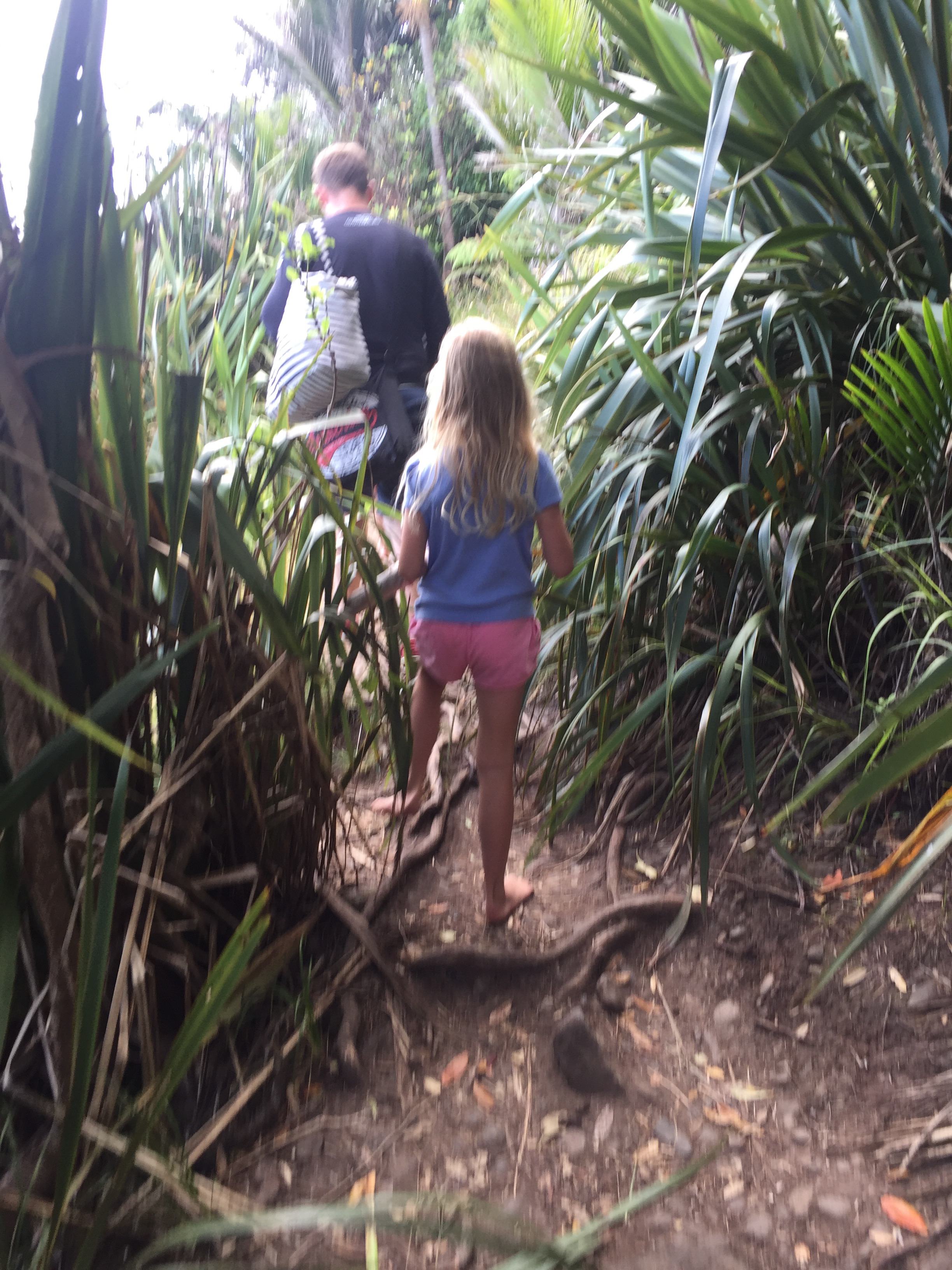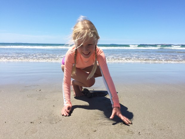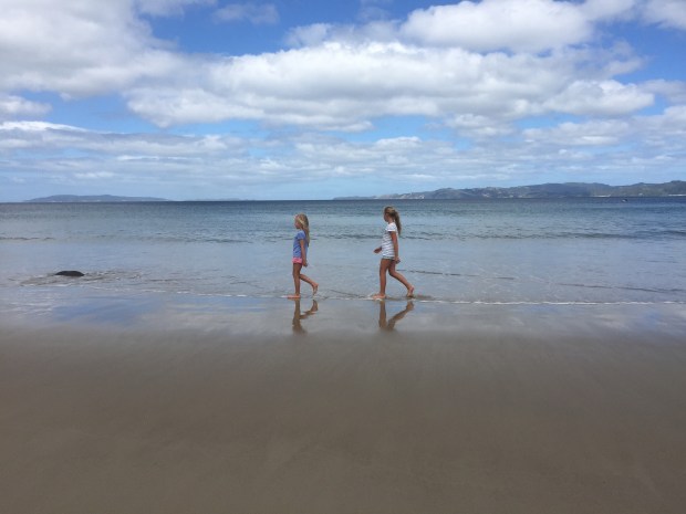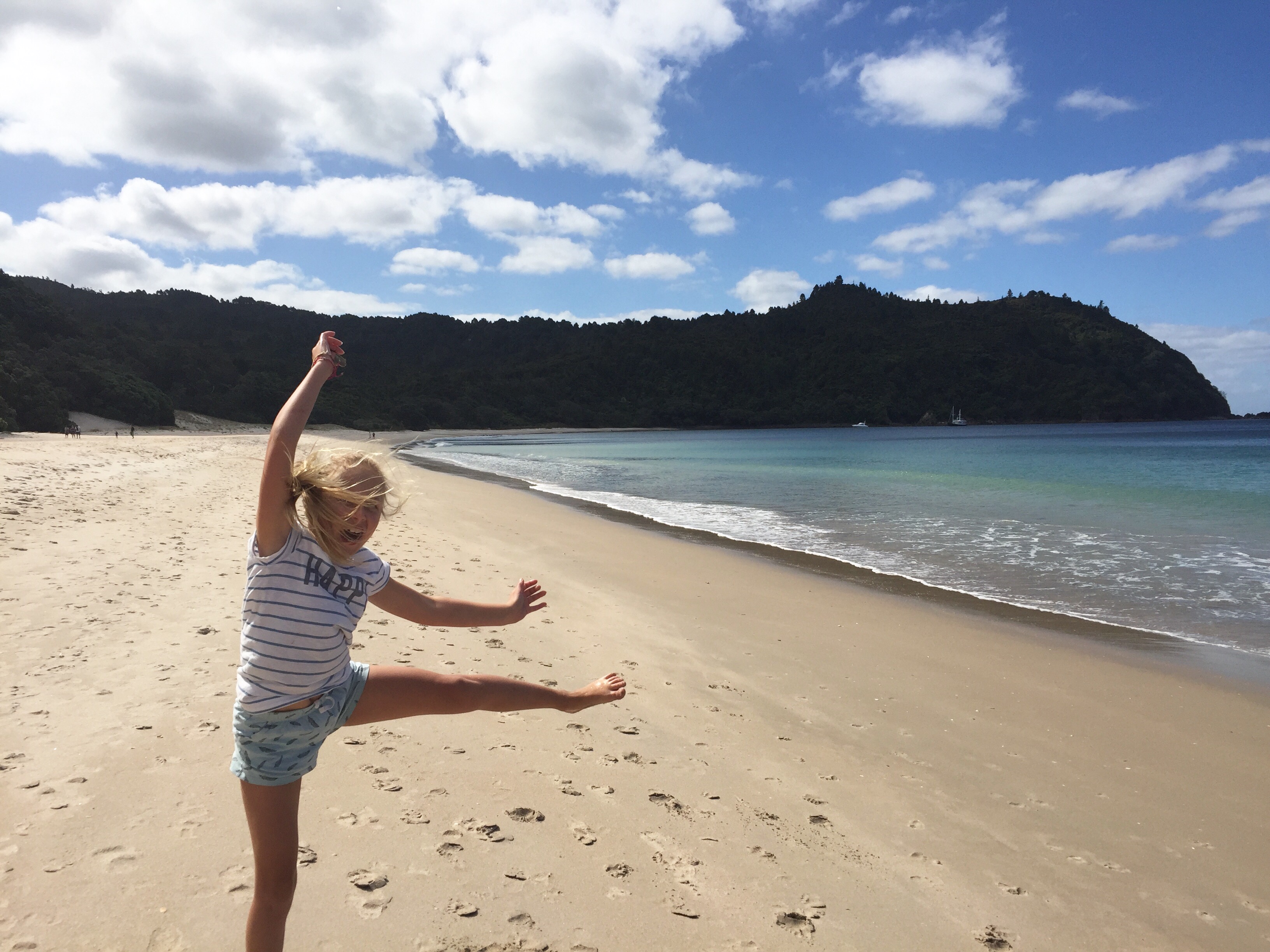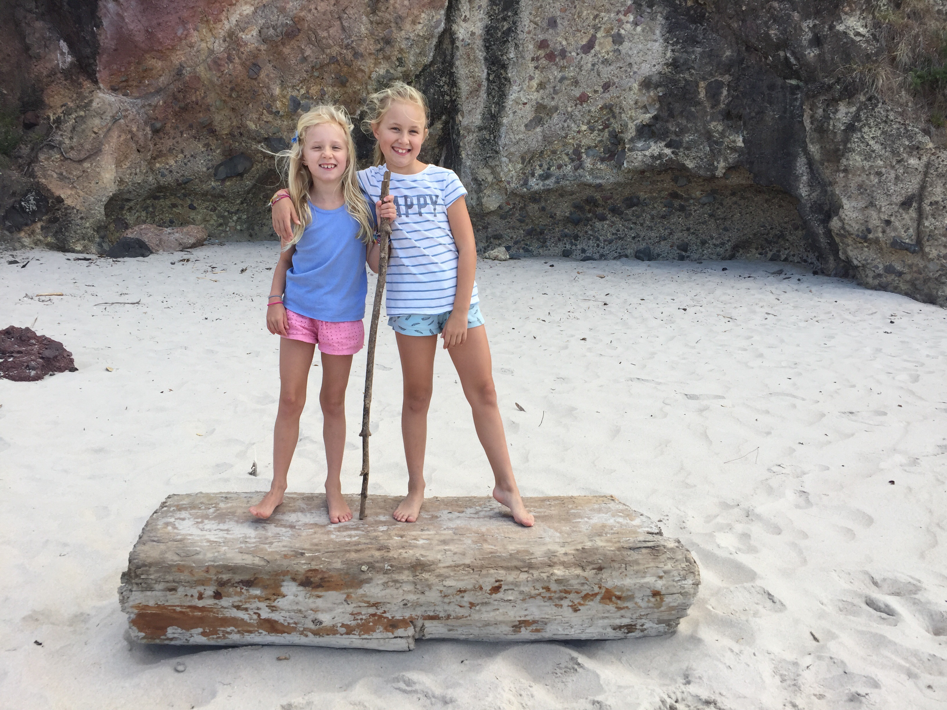 On our second day we decided to find New Chums Beach, now this beach has made its way into the top ten of the beaches in the world list! So we could hardly just drive by! There isn’t really a pathway to the beach and it can only be reached during low tide by scrambling over the rocks, through the bush and around the rocky headland. When we finally made it to the beach after the 30 minute trek we had a perfect golden sweeping beach stretching out in front of us, with a rocky backdrop and little caves for the children to climb in, Pohutukawa trees overhanging to give shade (and the girls to climb in!!!) and gentle lapping waves to splash in! Beautiful! It was a little cloudy and there was a bit of a breeze when we were there but we could all still see why it had found its place on the list!