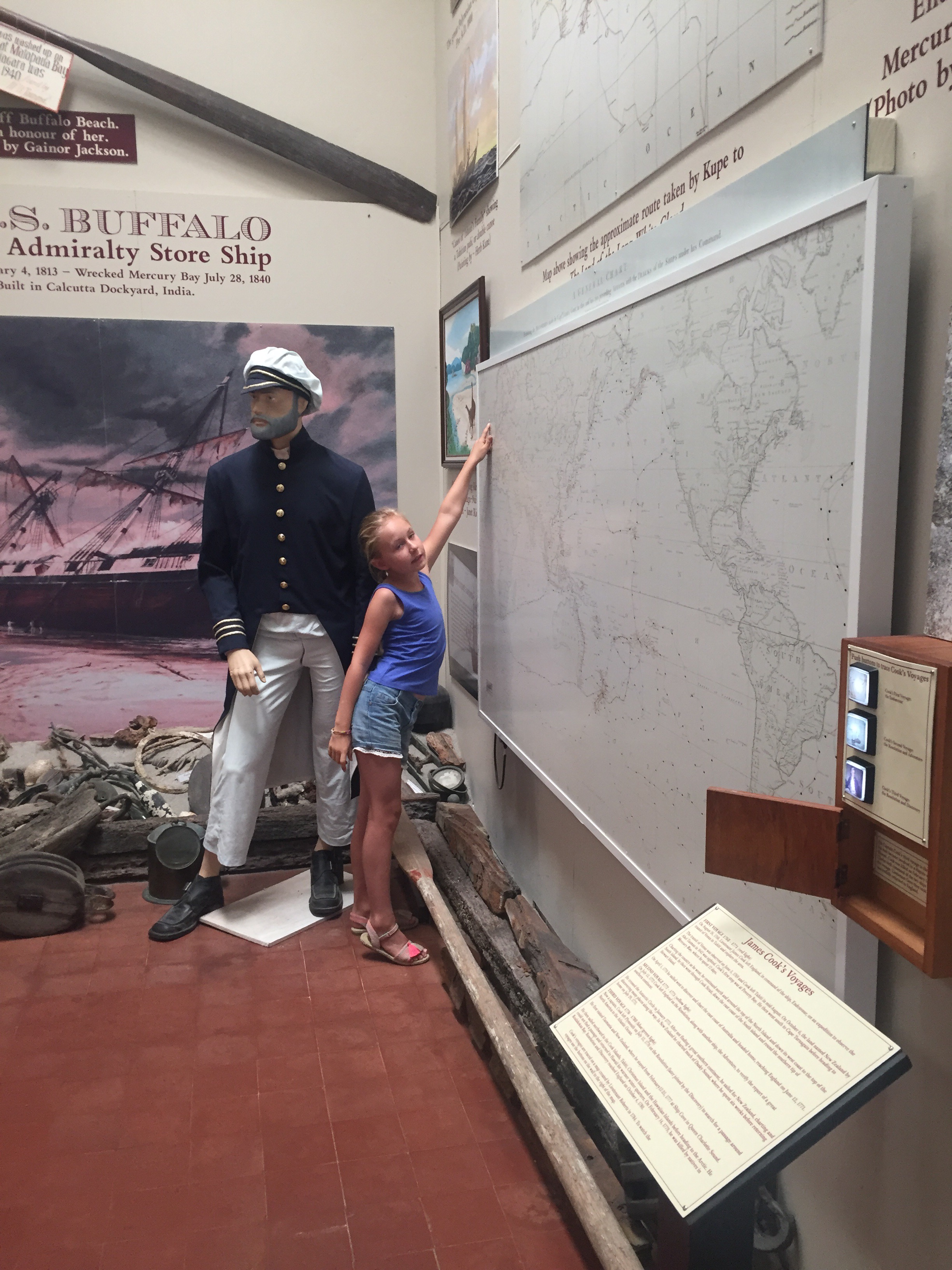 Yesterday we moved south on the eastern side of the coromandel to a lovely town called Tairua. On the way down we stopped at the whitianga museum for a school trip! The museum is filled with some wonderful exhibits from the areas Polynesian past, James cook adventures to marine and plant life! A real gem of a museum! The girls loved the James Cook area, seeing his journeys light up on the huge interactive map, and the model of the extinct life size Moa was a surprise when you came round the corner! It was crammed full of things for the children to do, and we spent a long time enjoying it all.