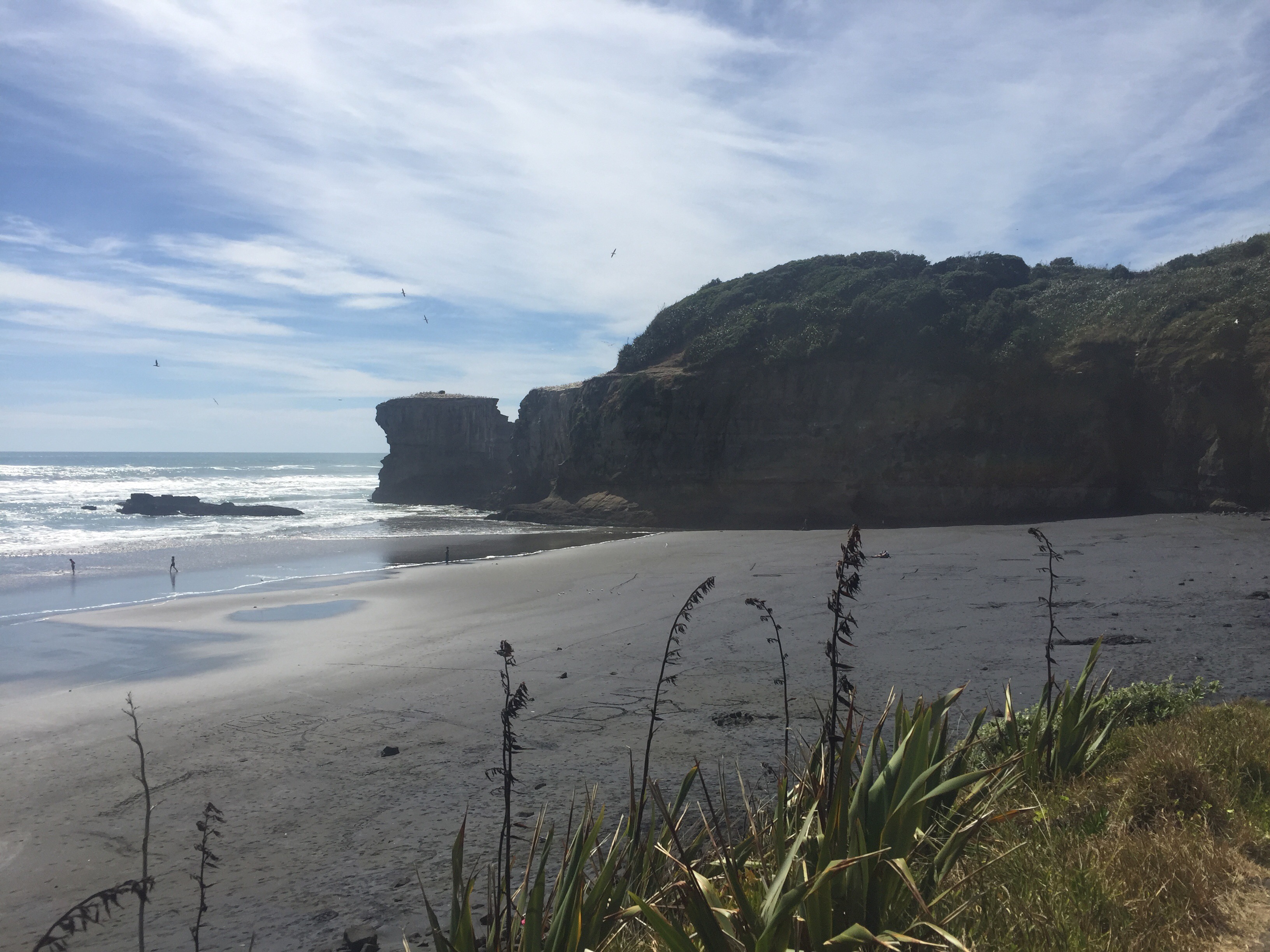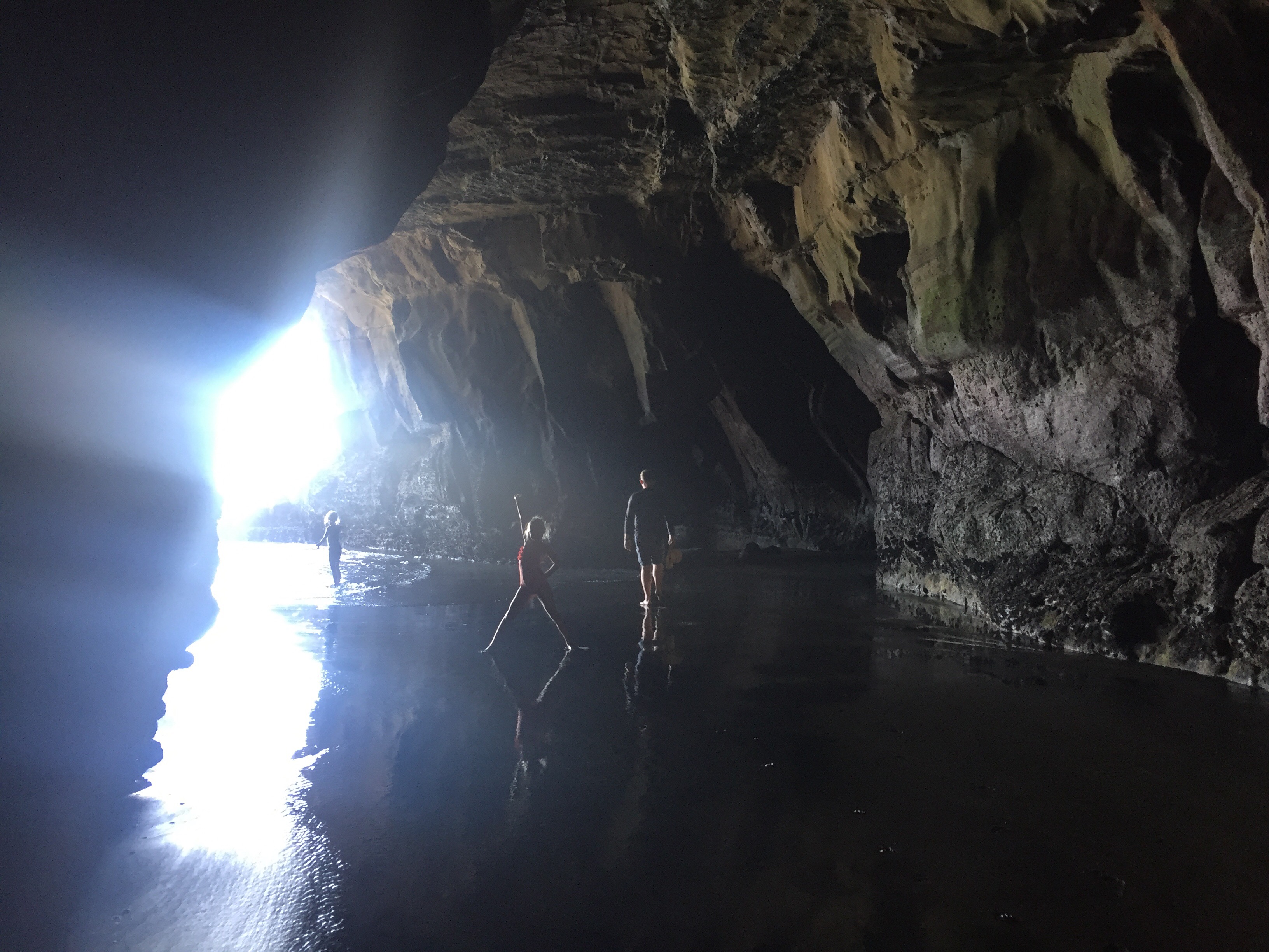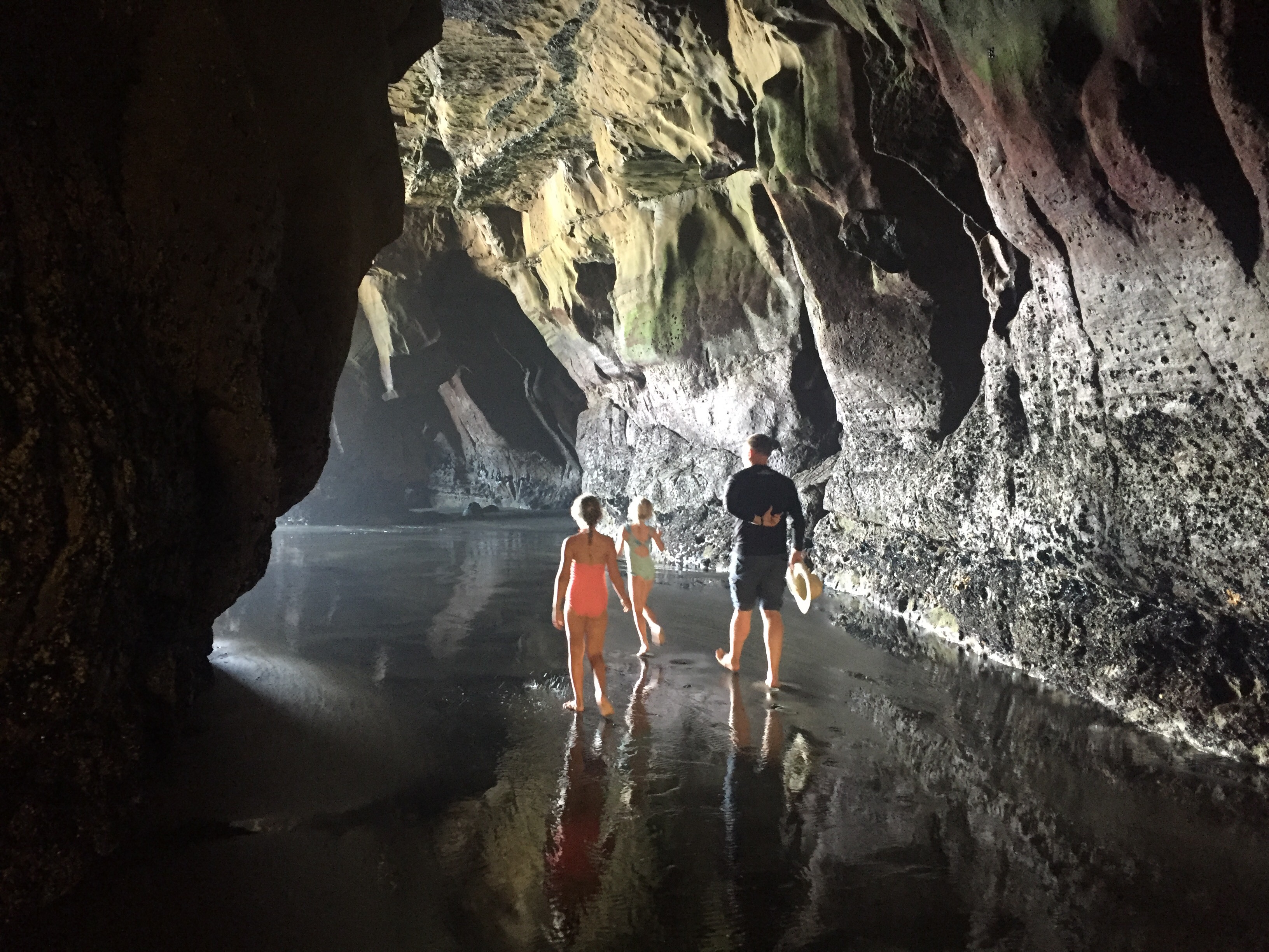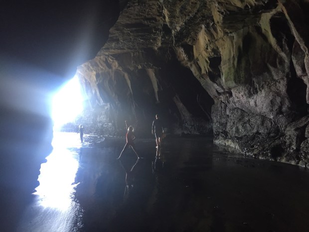 We then drove further north to Muriwai and found an absolute gem of a beach, with hardly anyone else there! Sparkling black sands, steep cliffs with rocky nesting areas for the huge garnet colony, and a fantastic cave that went deep into the cliff face and out to the crashing sea waves!