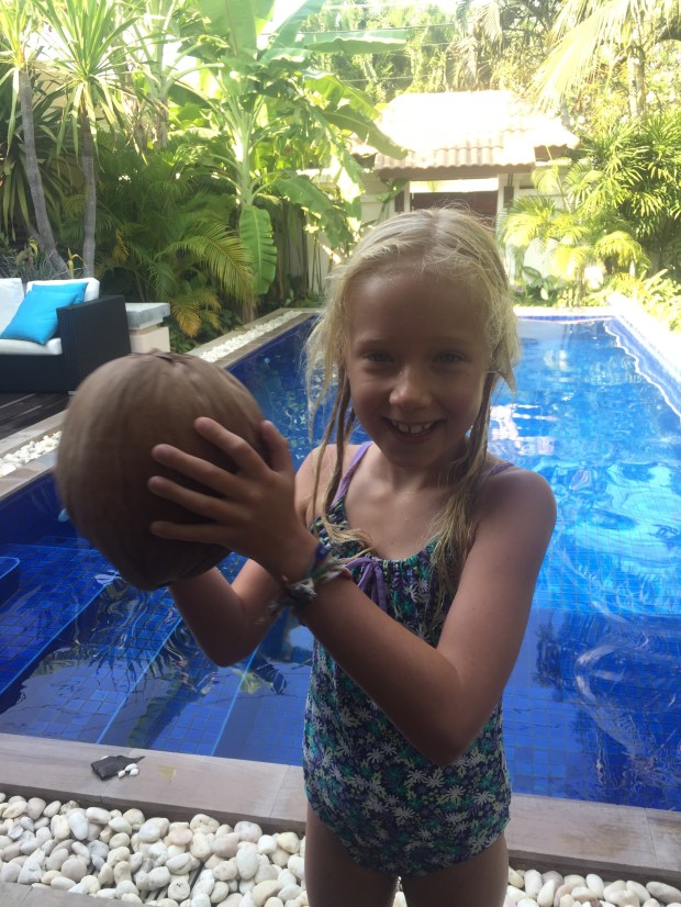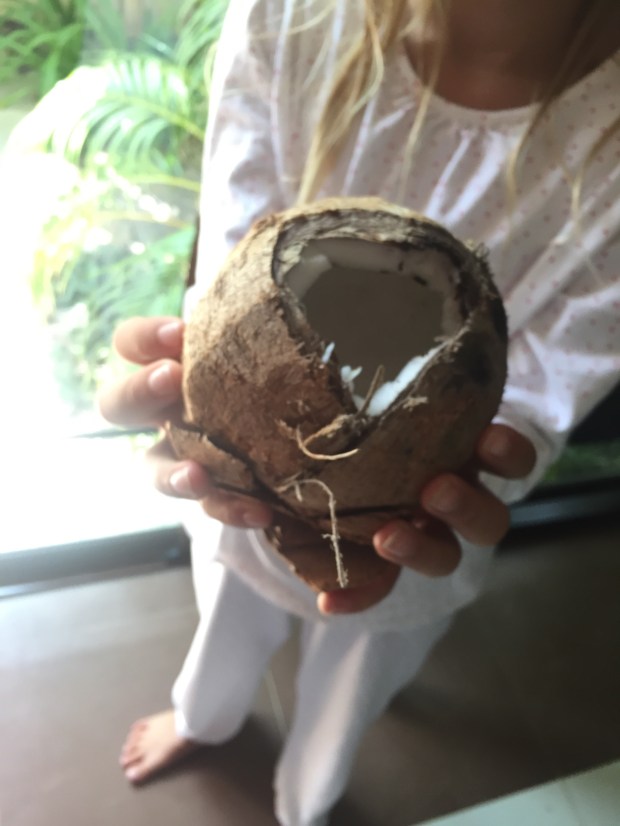We also did some topic work on coconuts and it was great when one fell out the tree onto the grass in the garden! So after watching a you tube video we de-husked as best we could with the kitchen knife to find the nut inside, before cracking it open to drink the water and try the white flesh! Daisy spent a long time making a video about it, and I thought to myself how wonderful travel schooling is!