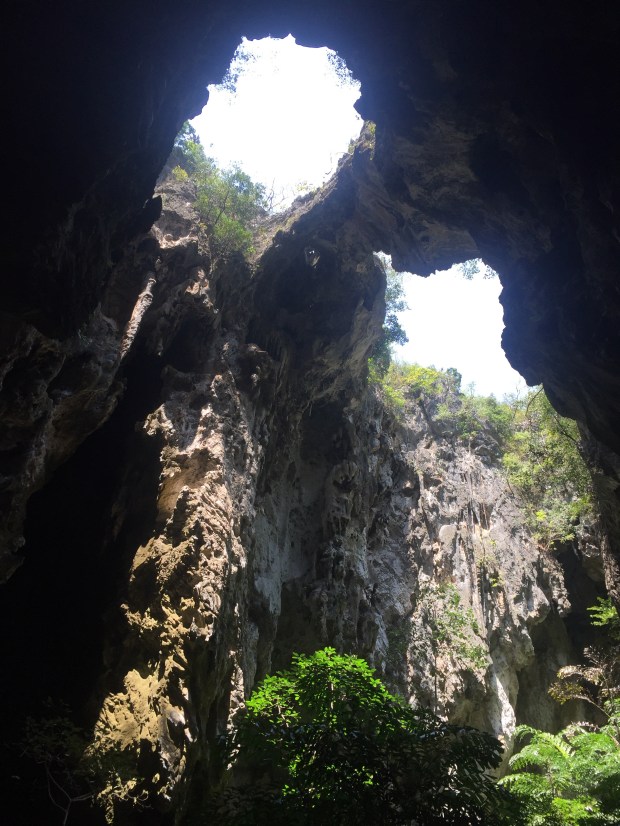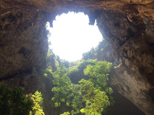 The first cave looked beautiful with a natural stone bridge overhead, lush plants and waterfall rock formations but the surreal beauty of the second cave was amazing! A short wooden bridge connects the two caves and upon entering we could see the sparkling pavilion standing in the centre surrounded by trees and vegetation, and basking in a beam of light that flooded in through the huge hole in the cave roof! We had made it and it felt like something out of an Indian Jones movie!
