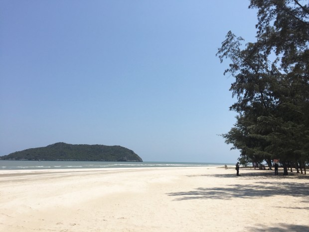 We drove to the small beach village of Bang Pu, and parked the car in an almost deserted dusty car park. We then walked through the quiet little market and empty beach cafes to the sandy beach, where we found a lady selling tickets for a small wooden boat to take us around the cape to Laem Sala beach, where we could climb the mountain to the cave!