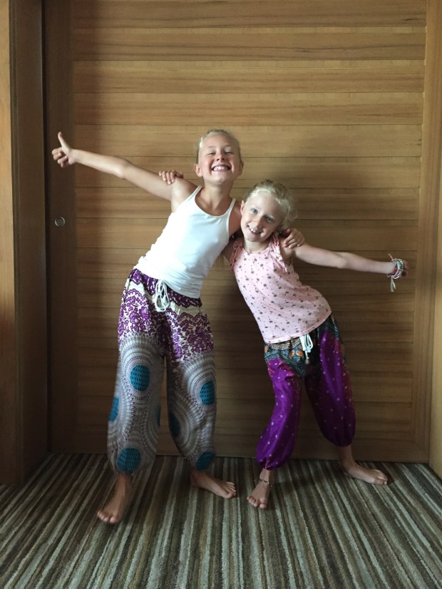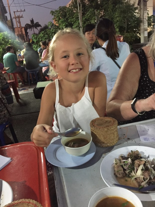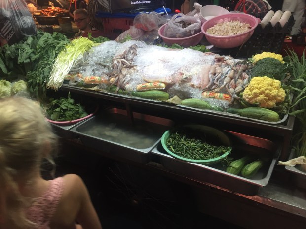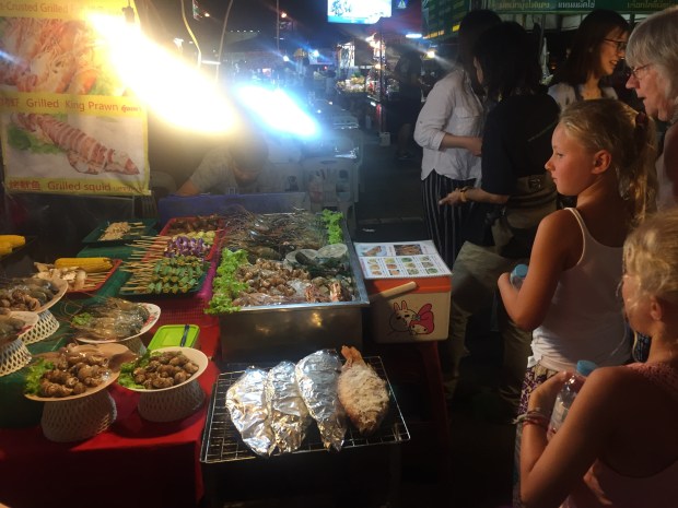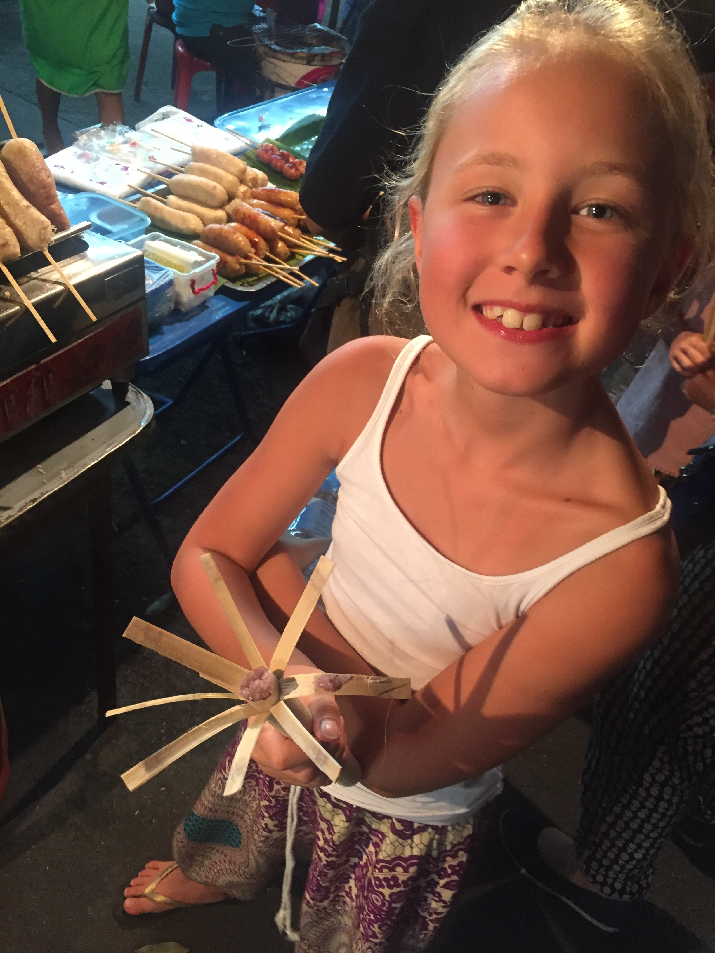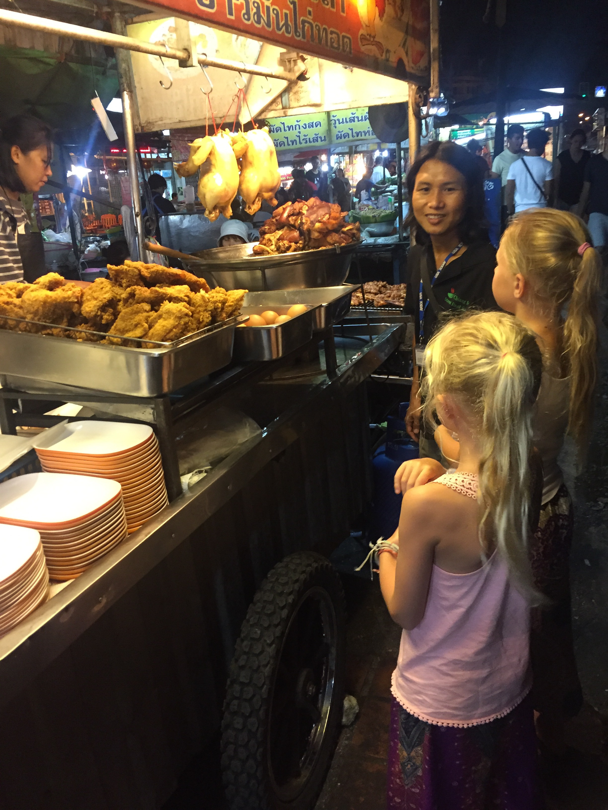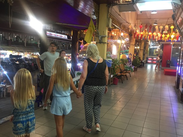 In the evening we decided to head out for dinner but not before heading to the night street market, which happens to be in the next street along from the hotel! Very handy! The girls picked out some pretty beaded bracelets with elephant charms and some soft printed trousers. Daisy says she feels like Jasmin from Aladdin in hers, and is going to wear them all the time! She does make me laugh!