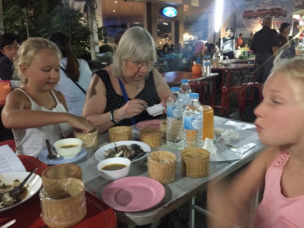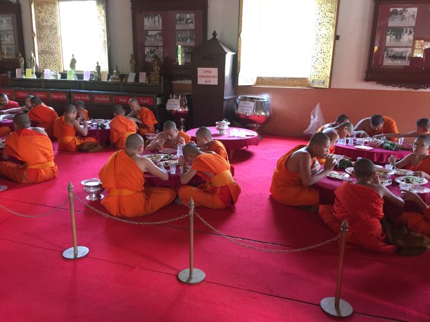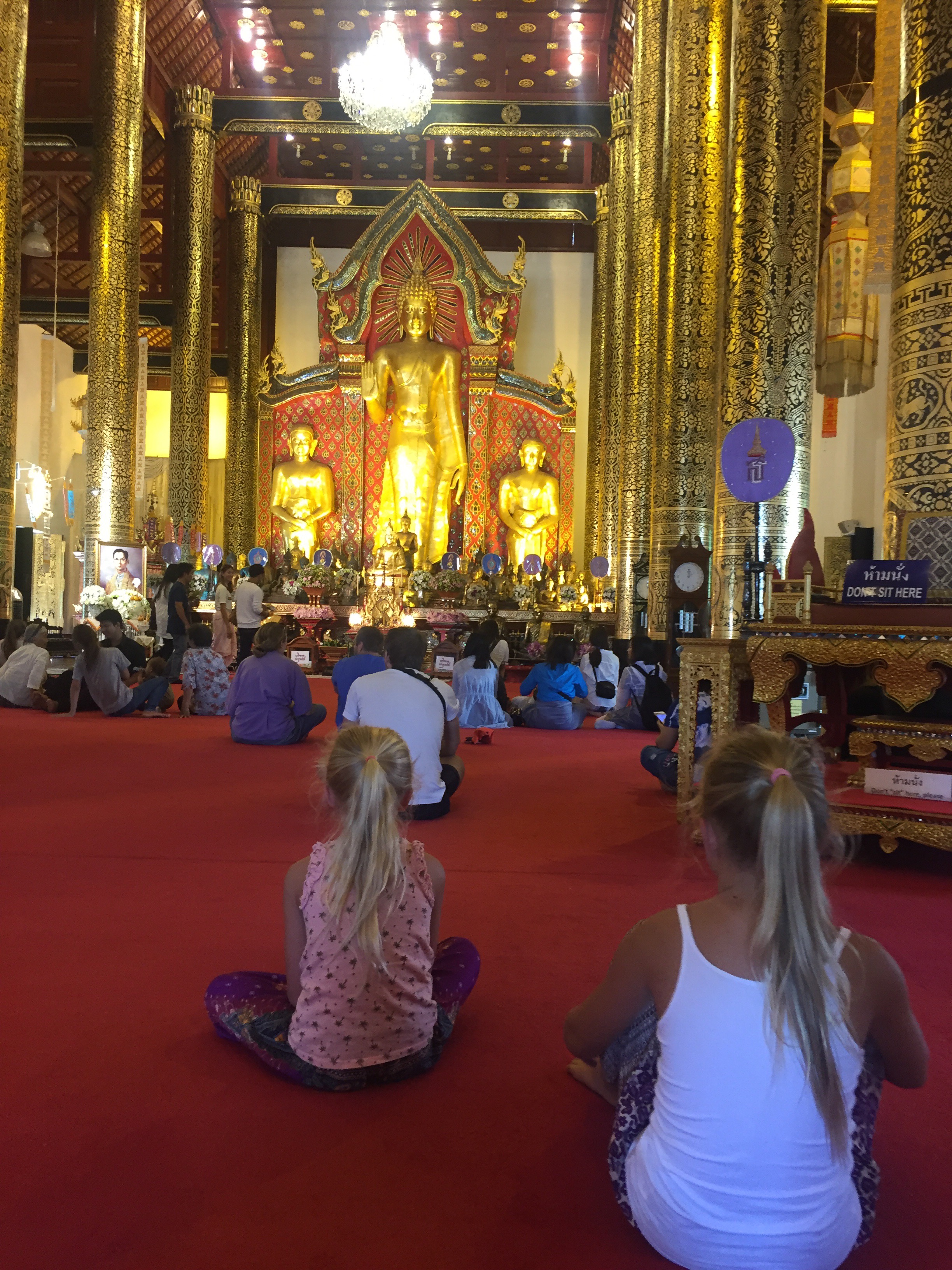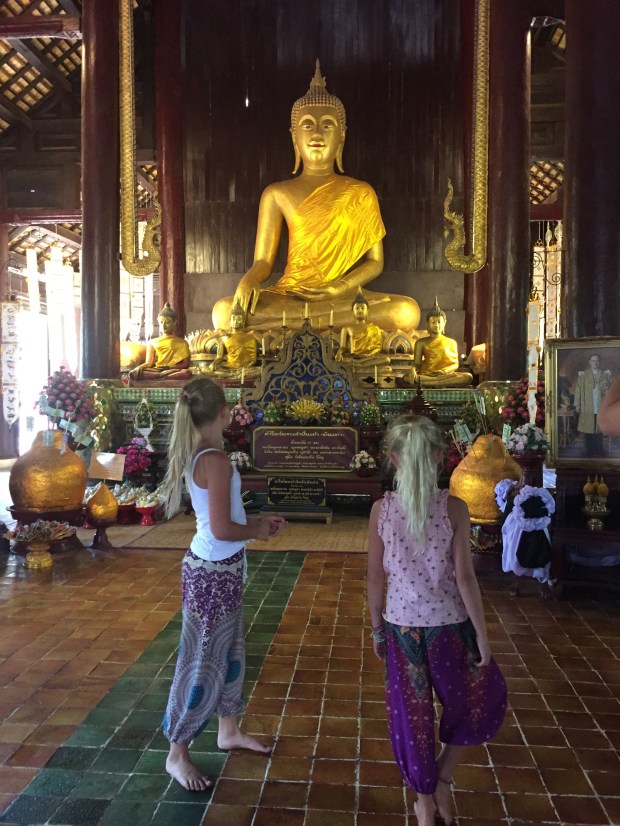 This central area also holds the most important temples, so we decided to spend yesterday morning walking from one to another, taking in the sights, sounds and smells as we went. The buildings were exquisitely decorated, each different but so beautiful. I was surprised how much the girls liked them and sat down with the other peaceful people worshiping inside. In one a large group of Monks were happily eating their lunch with beaming smiles and it was fascinating to see the elder monks sat in meditation, hardly moving a muscle!