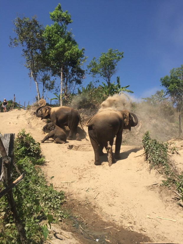 Daisy: when the elephants walked back they stopped and picked up dust and dirt and threw it all over themselves!