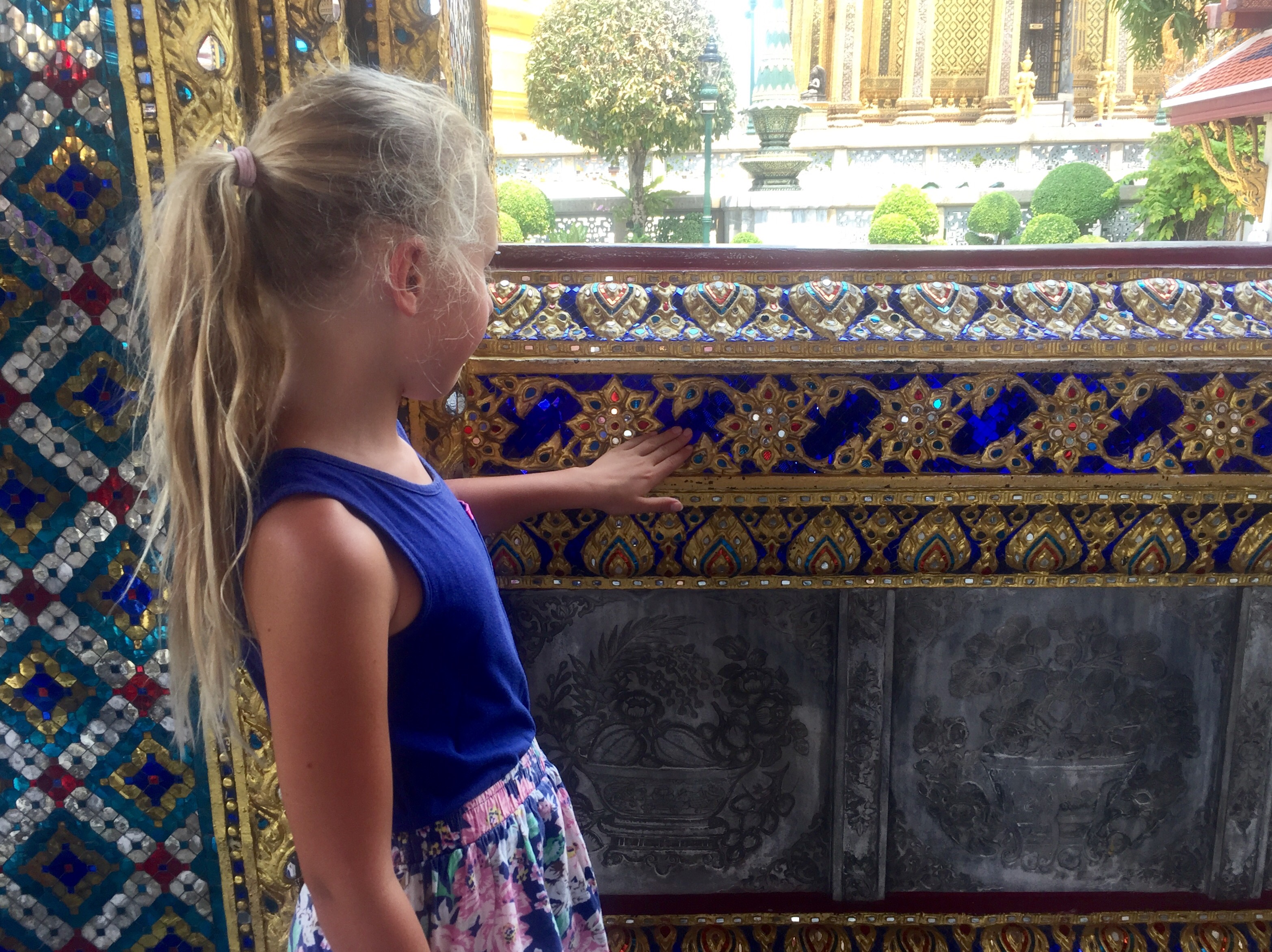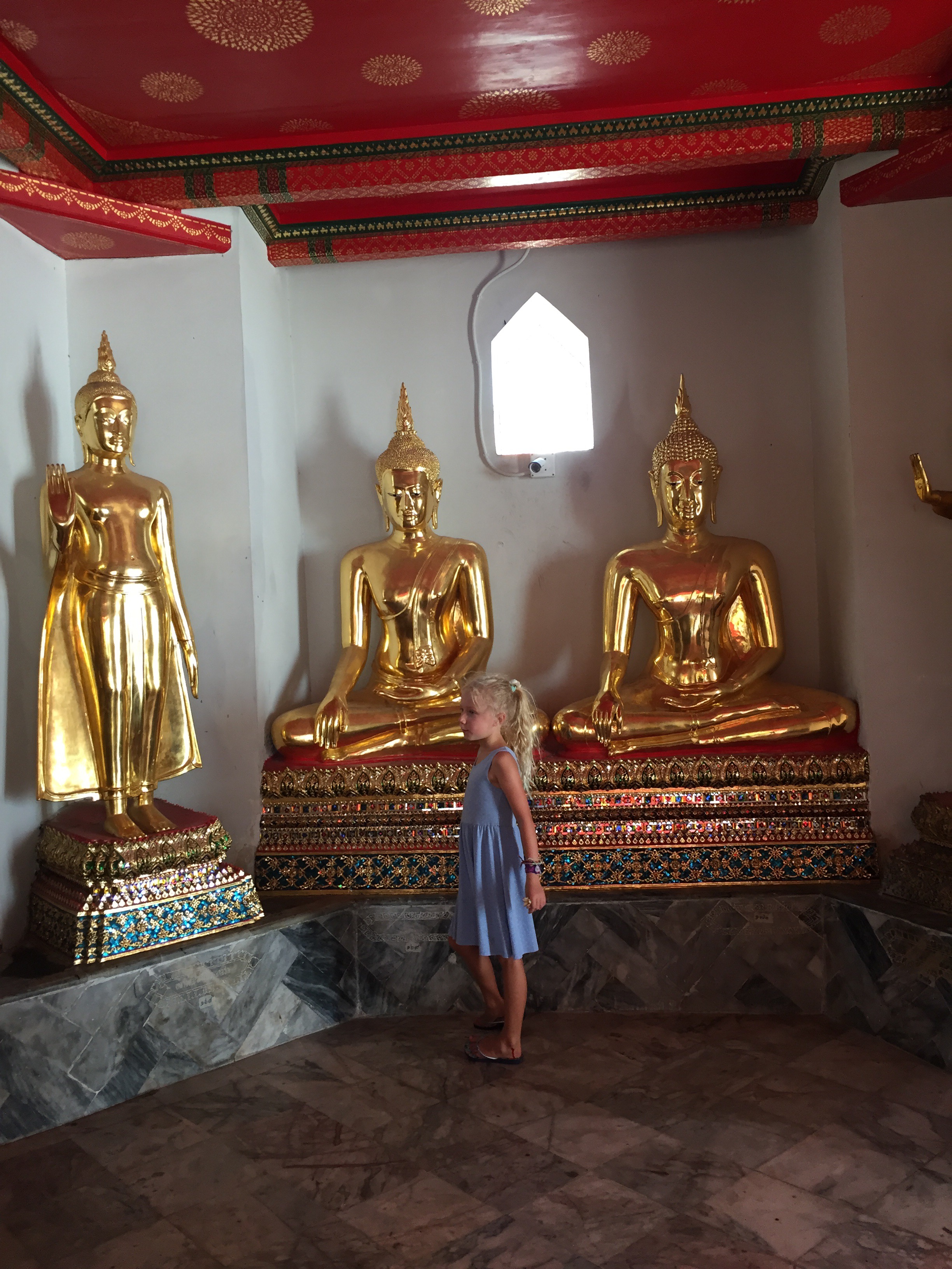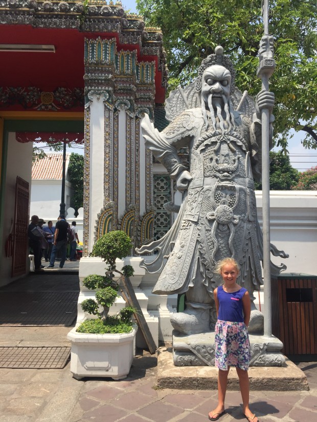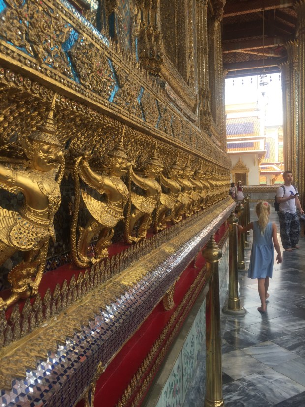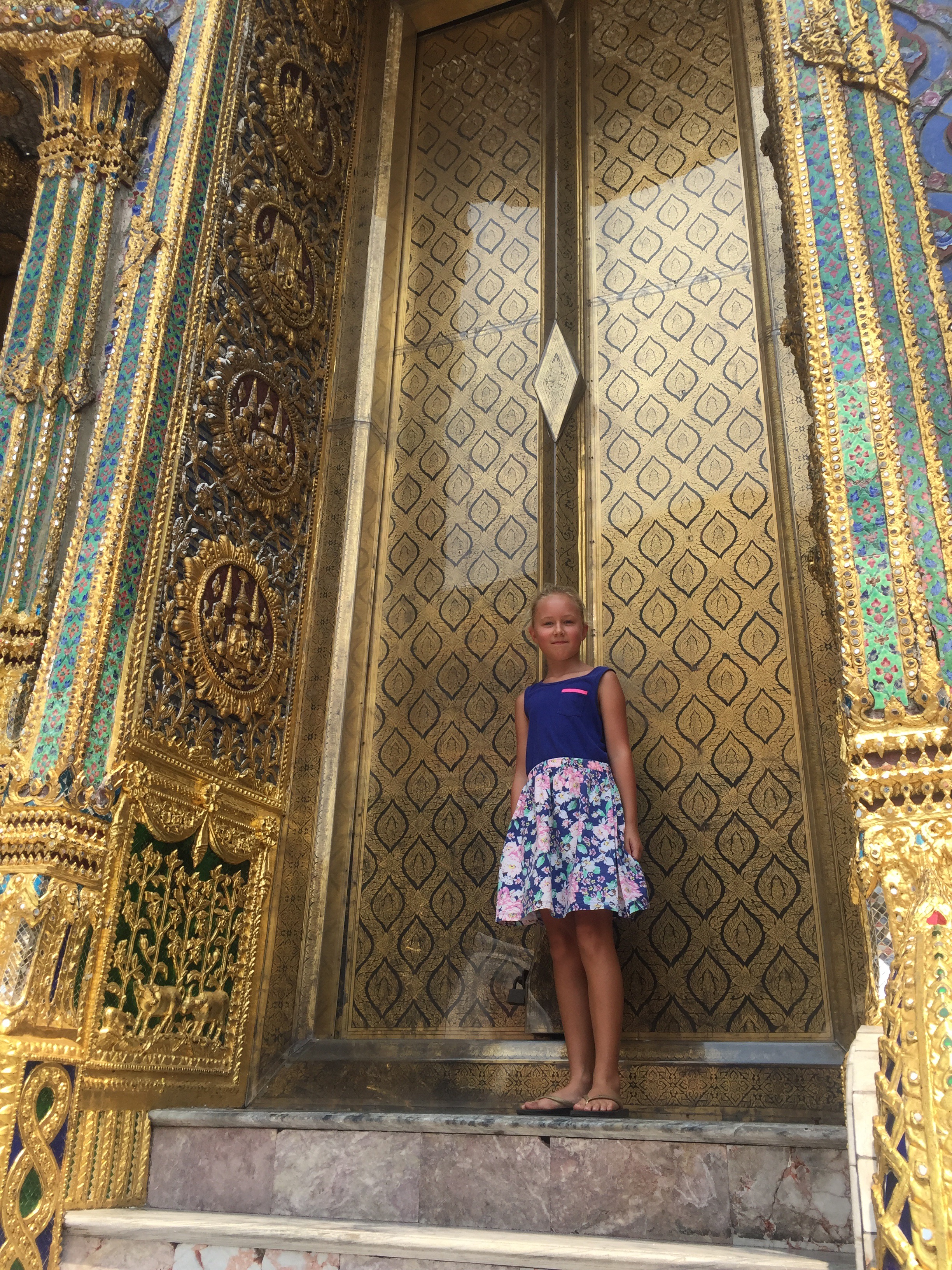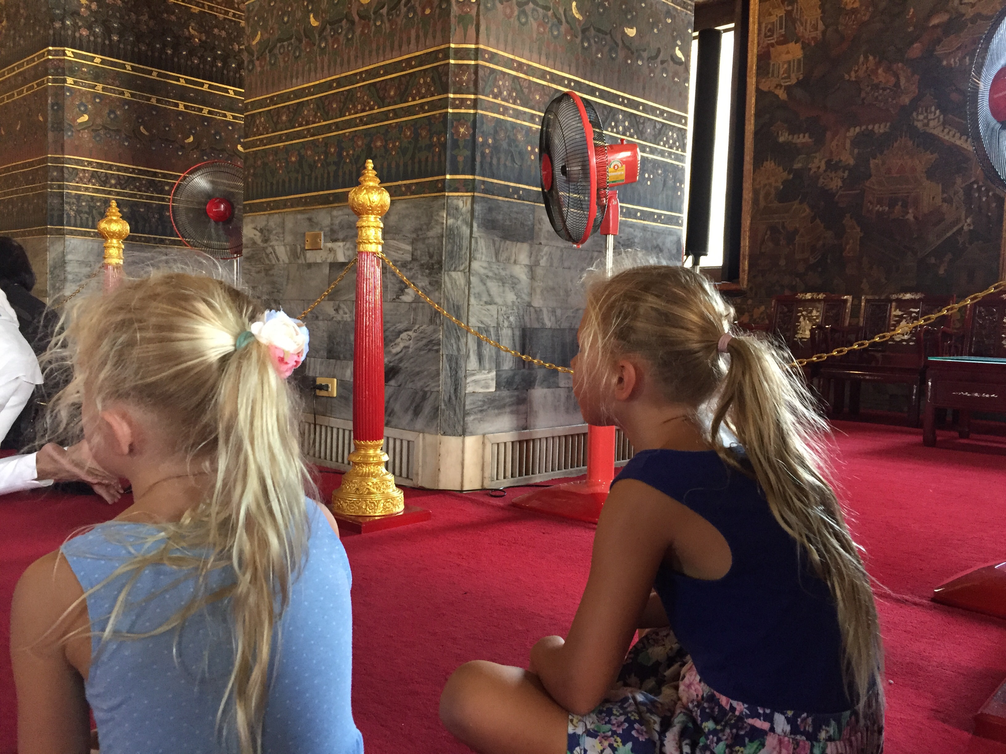 We nipped in and out of the many adorned buildings and found shelter from the sun where we could! Thankfully there were a couple of electric fans around to create a slight breeze, and a kind security guard even let us into the Thai only section inside the Wat Phra Kaew temple to see the Emerald Buddha. I think he took pitty on my flushed white haired children! 😂