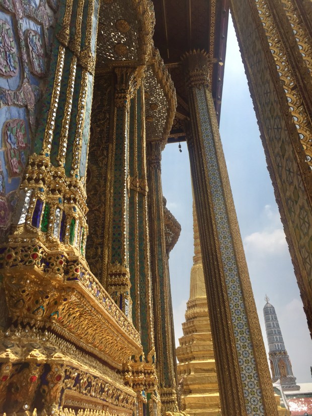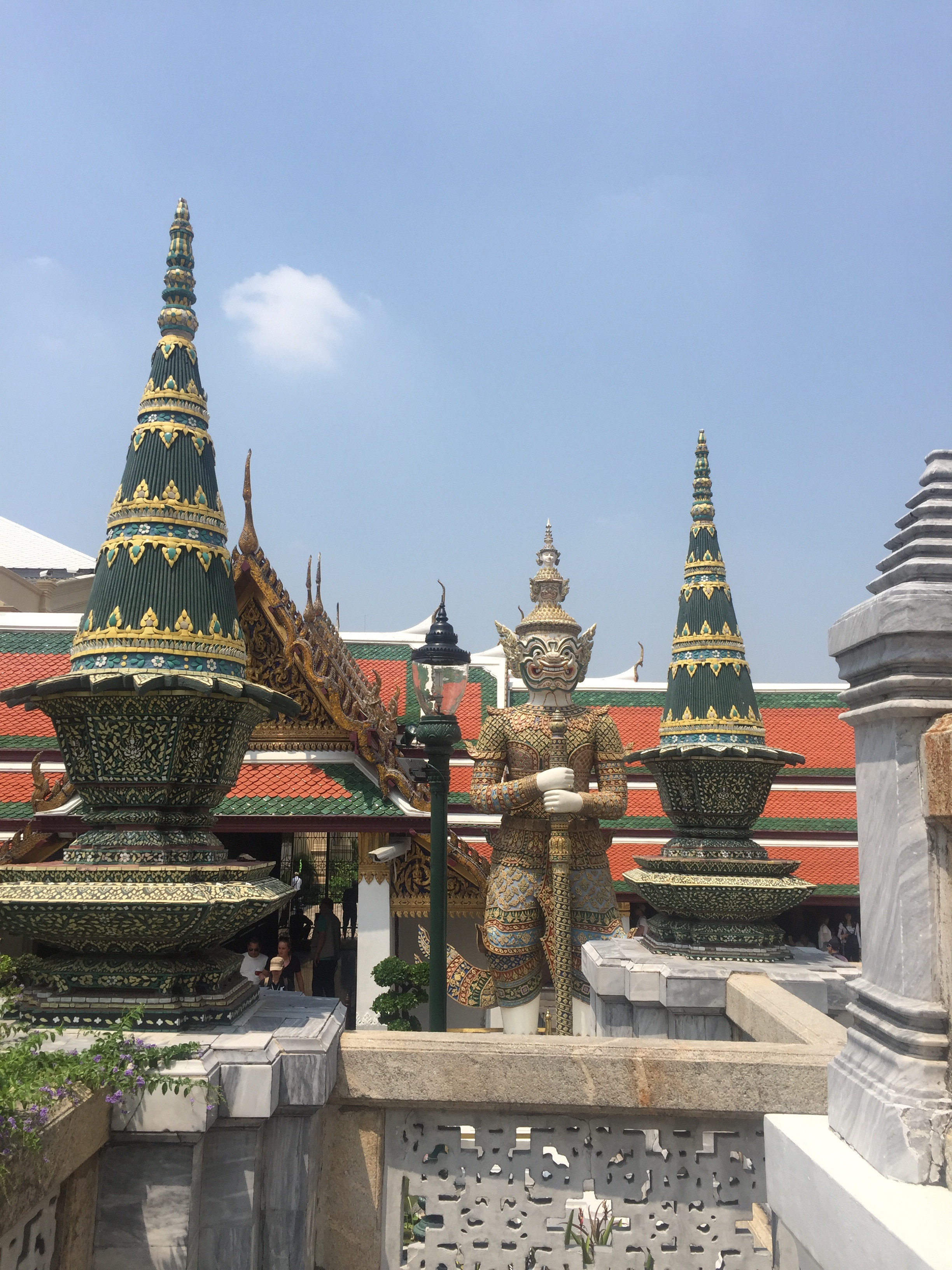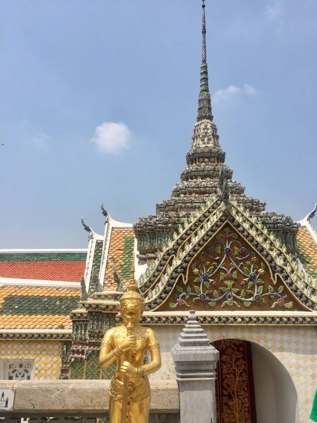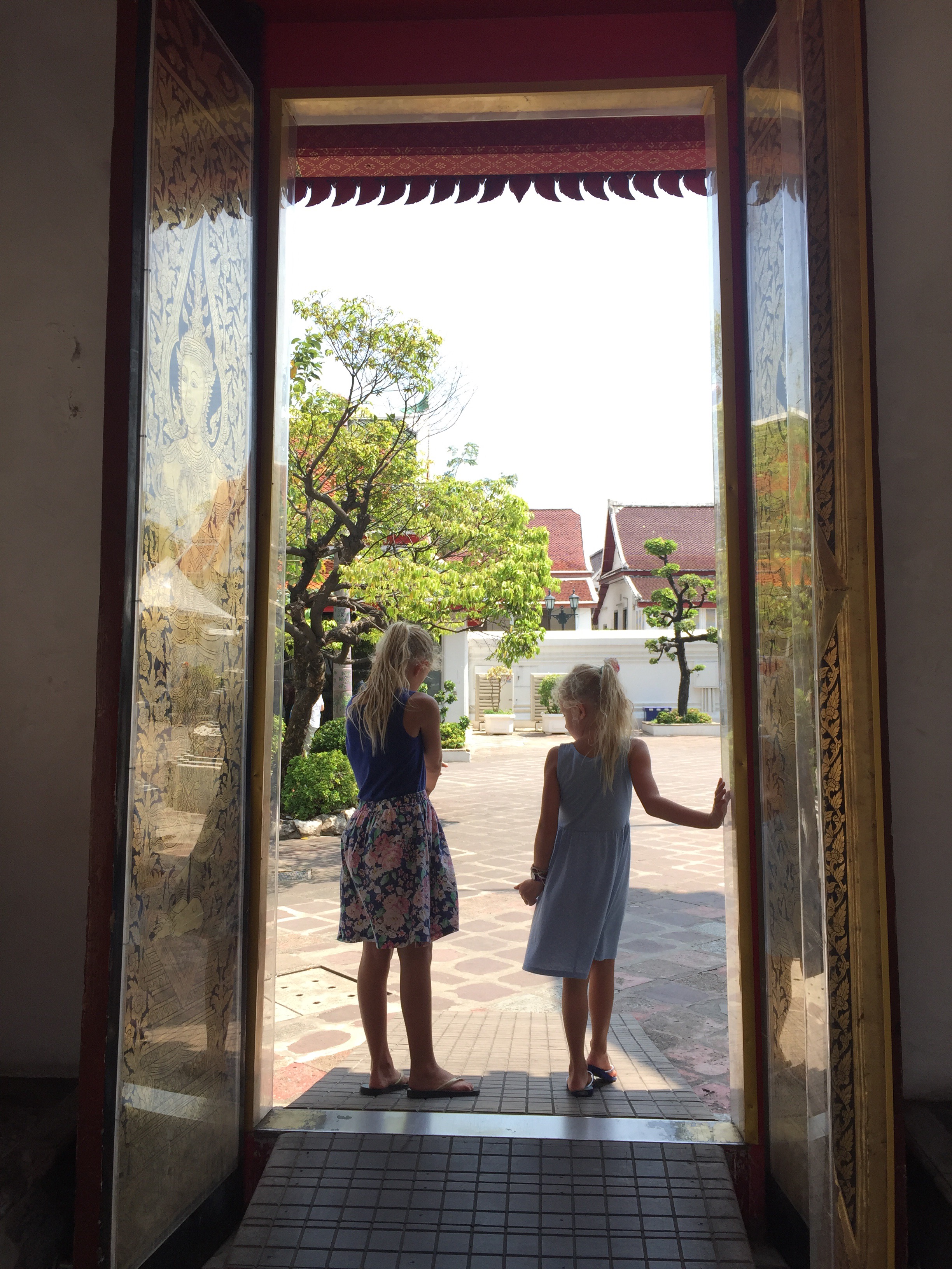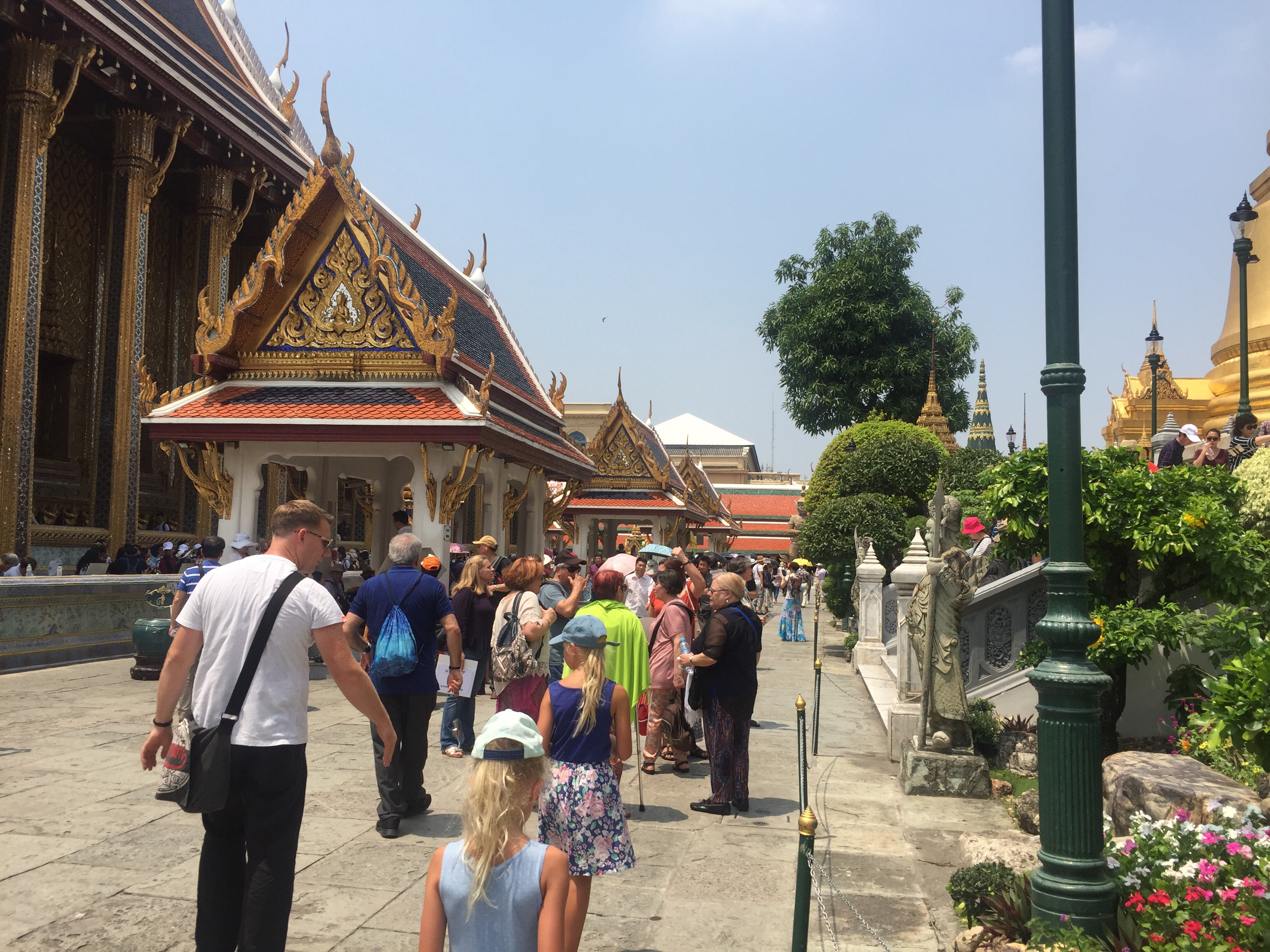 We nipped in and out of the many adorned buildings and found shelter from the sun where we could! Thankfully there were a couple of electric fans around to create a slight breeze, and a kind security guard even let us into the Thai only section inside the Wat Phra Kaew temple to see the Emerald Buddha. I think he took pitty on my flushed white haired children! 😂