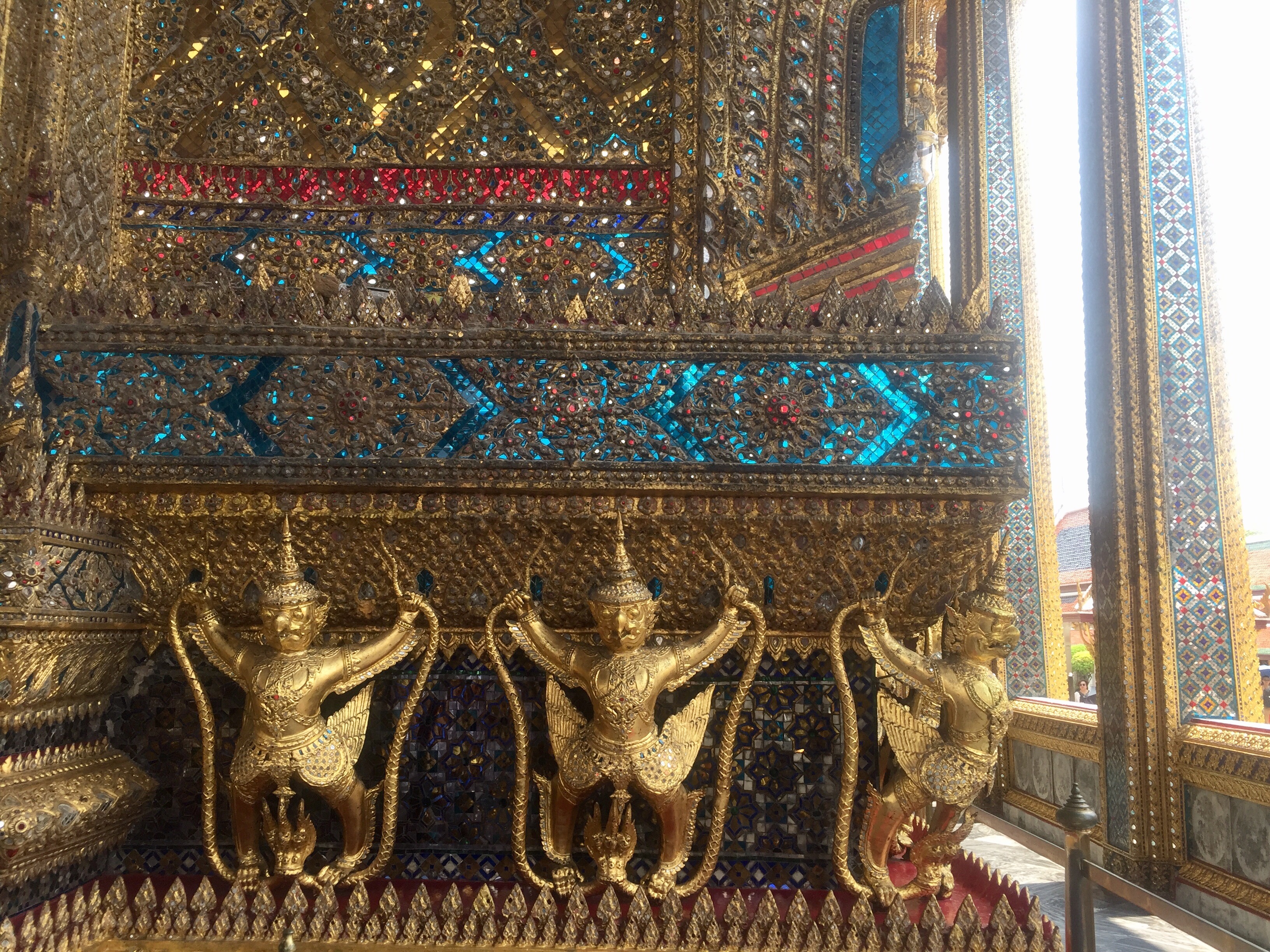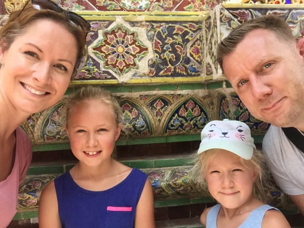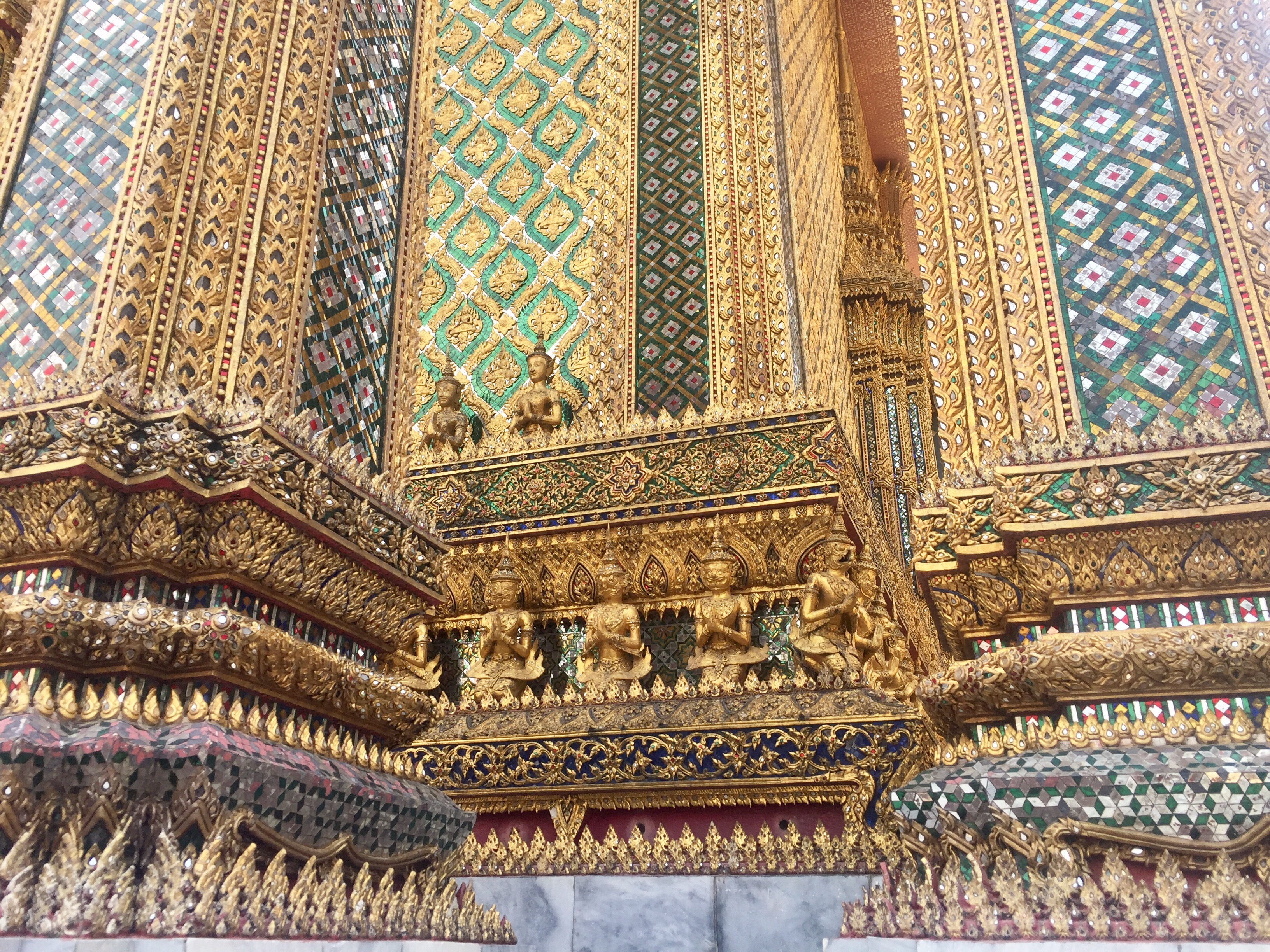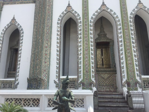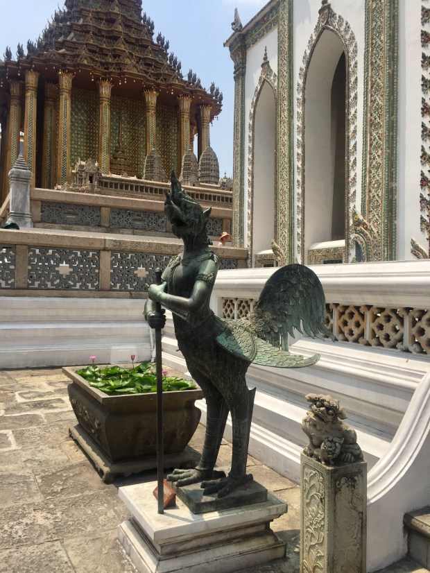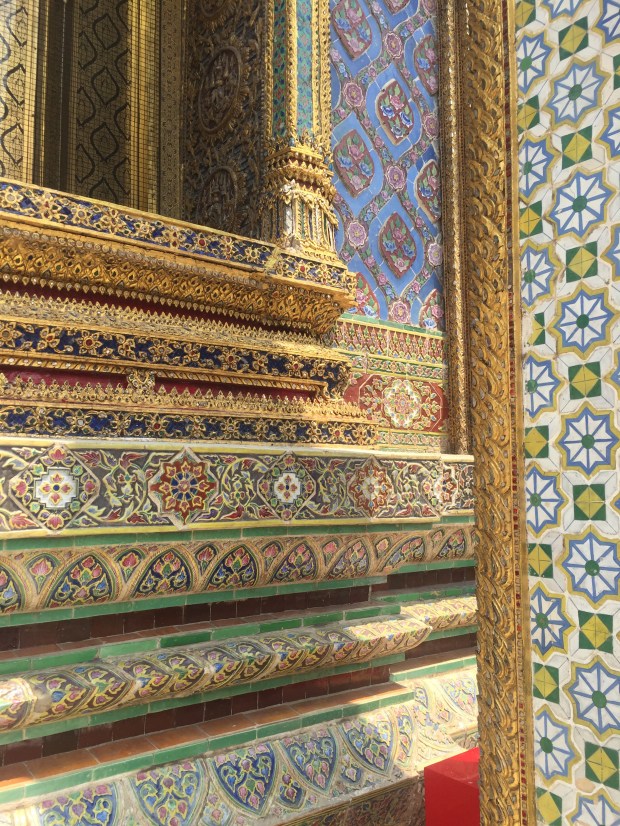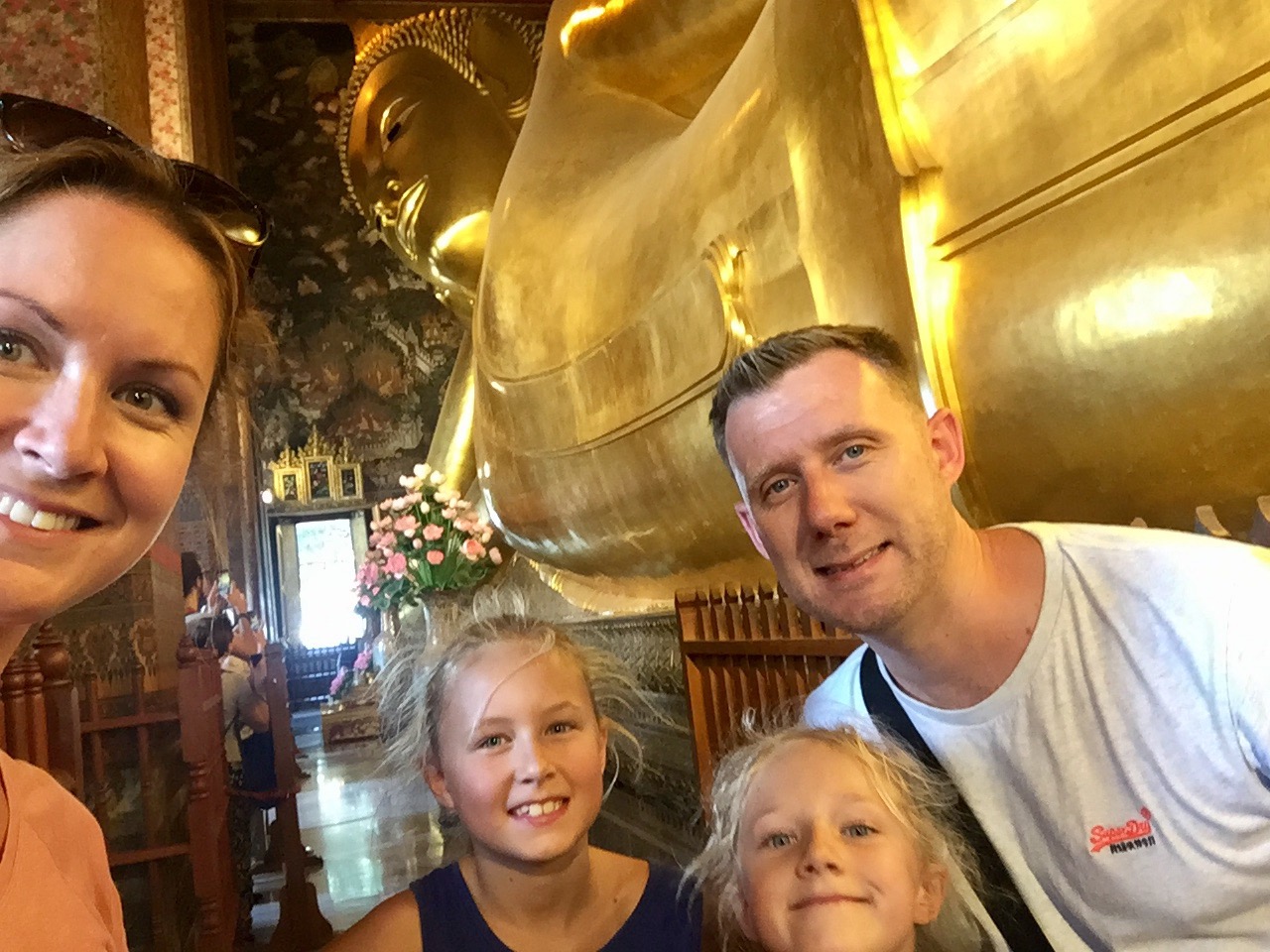 We nipped in and out of the many adorned buildings and found shelter from the sun where we could! Thankfully there were a couple of electric fans around to create a slight breeze, and a kind security guard even let us into the Thai only section inside the Wat Phra Kaew temple to see the Emerald Buddha. I think he took pitty on my flushed white haired children! 😂