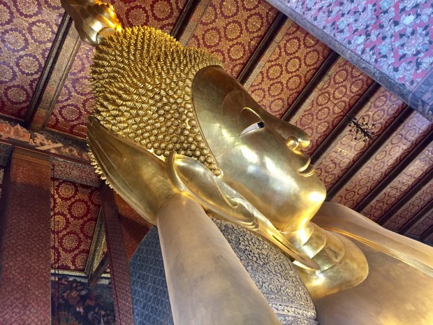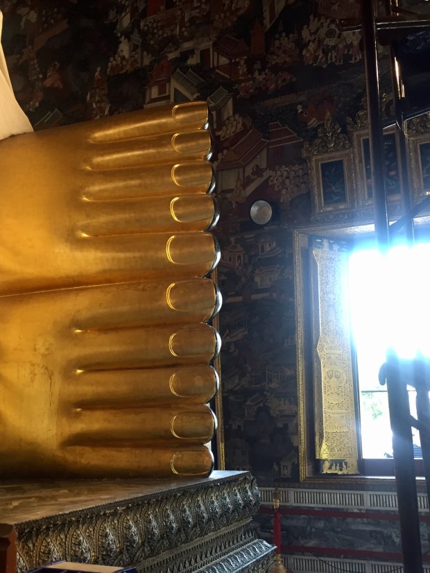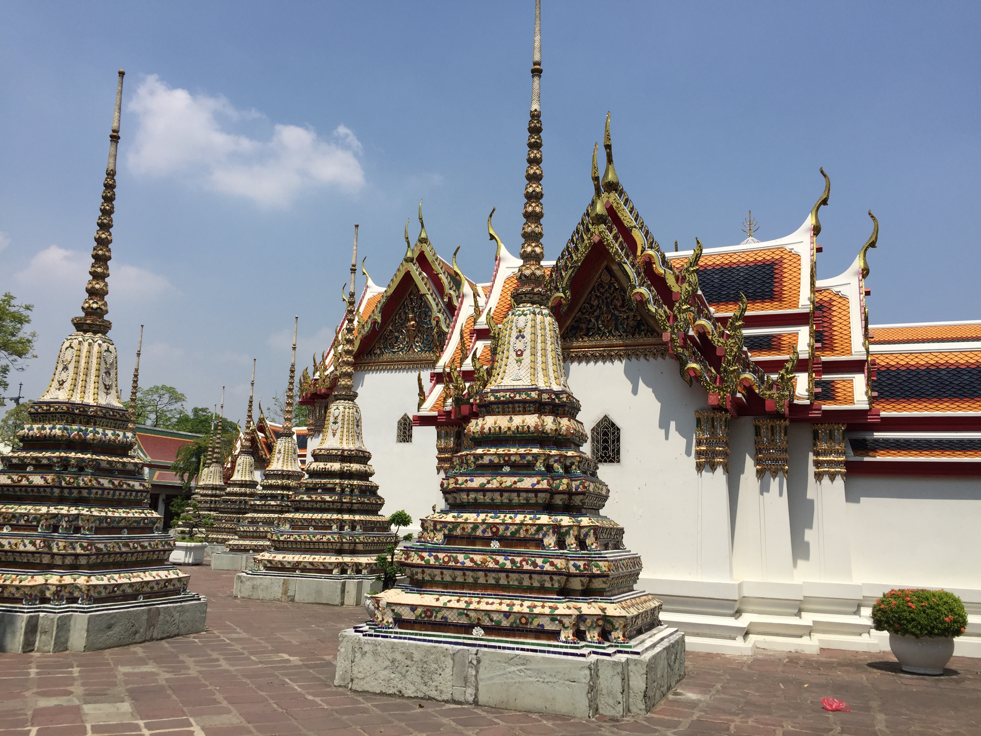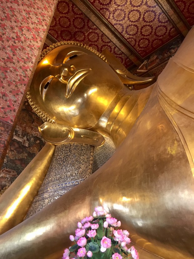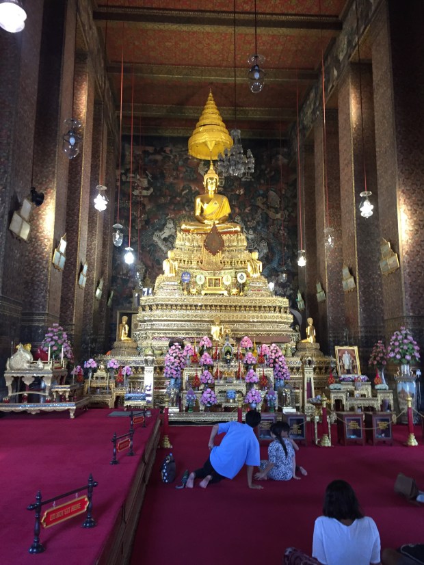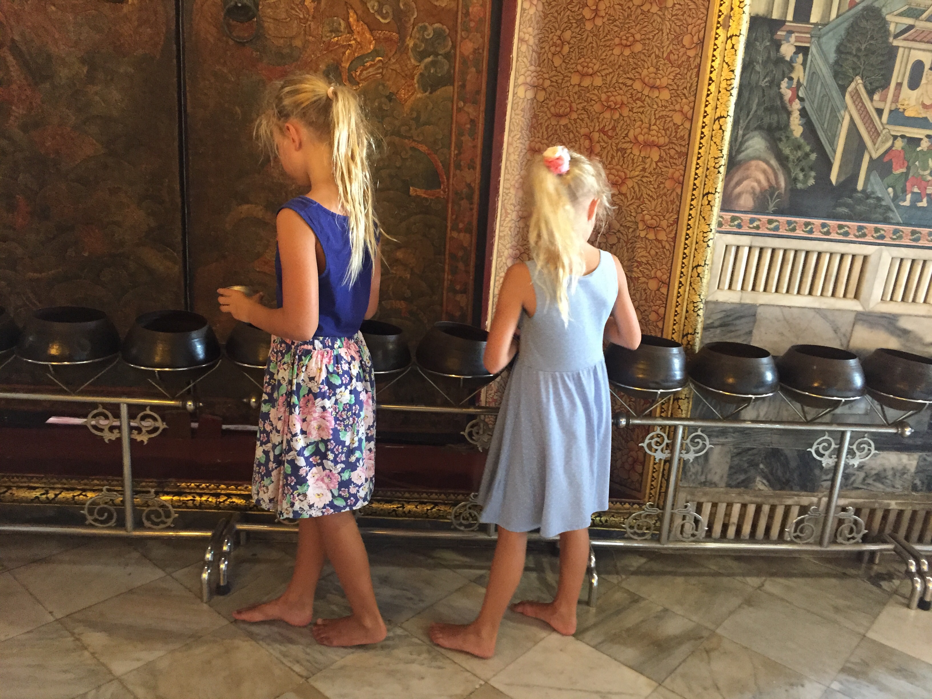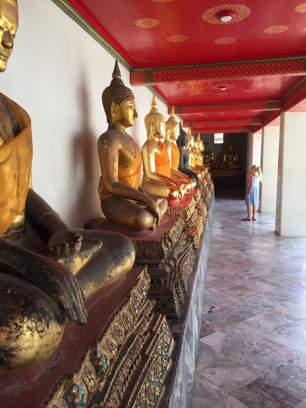 After battling the crowds we decided to head back out to the street, jumped into the first tuk tuk and sped off to the nearby Wat Pho, the Temple of the Reclining Buddha. Here was a much more relaxing complex, with a handful of visitors! The buildings were again all beautifully decorated and we began firstly with visiting the famous 46 metre long golden Buddha enshrined in a richly decorated temple. The girls then enjoyed dropping coins into the blessing pots, before some leisurely strolling around the different courtyards and temples all full of golden Buddhas. A beautiful place.