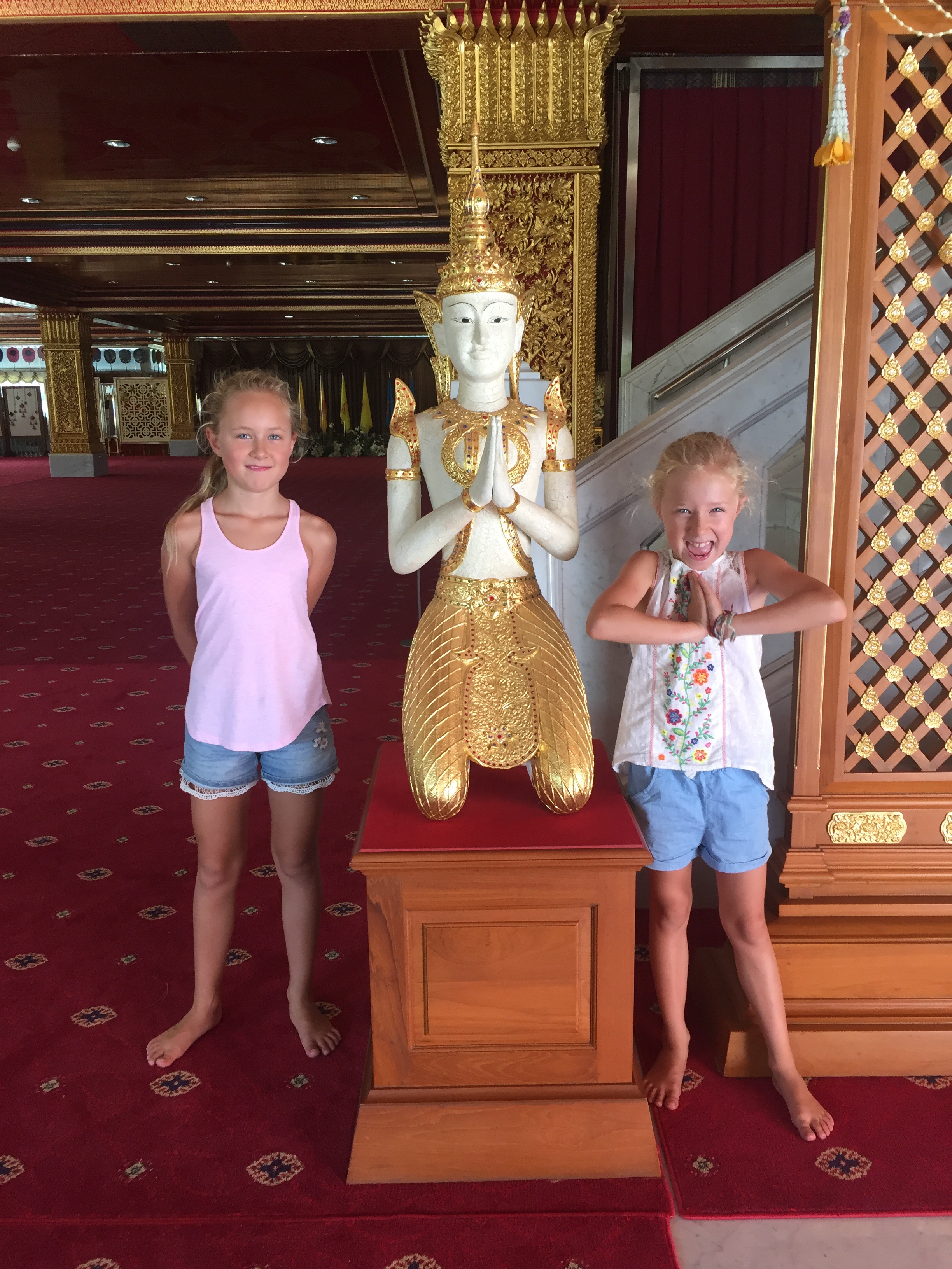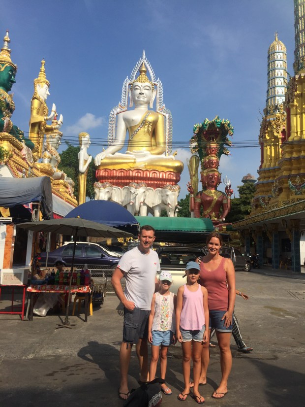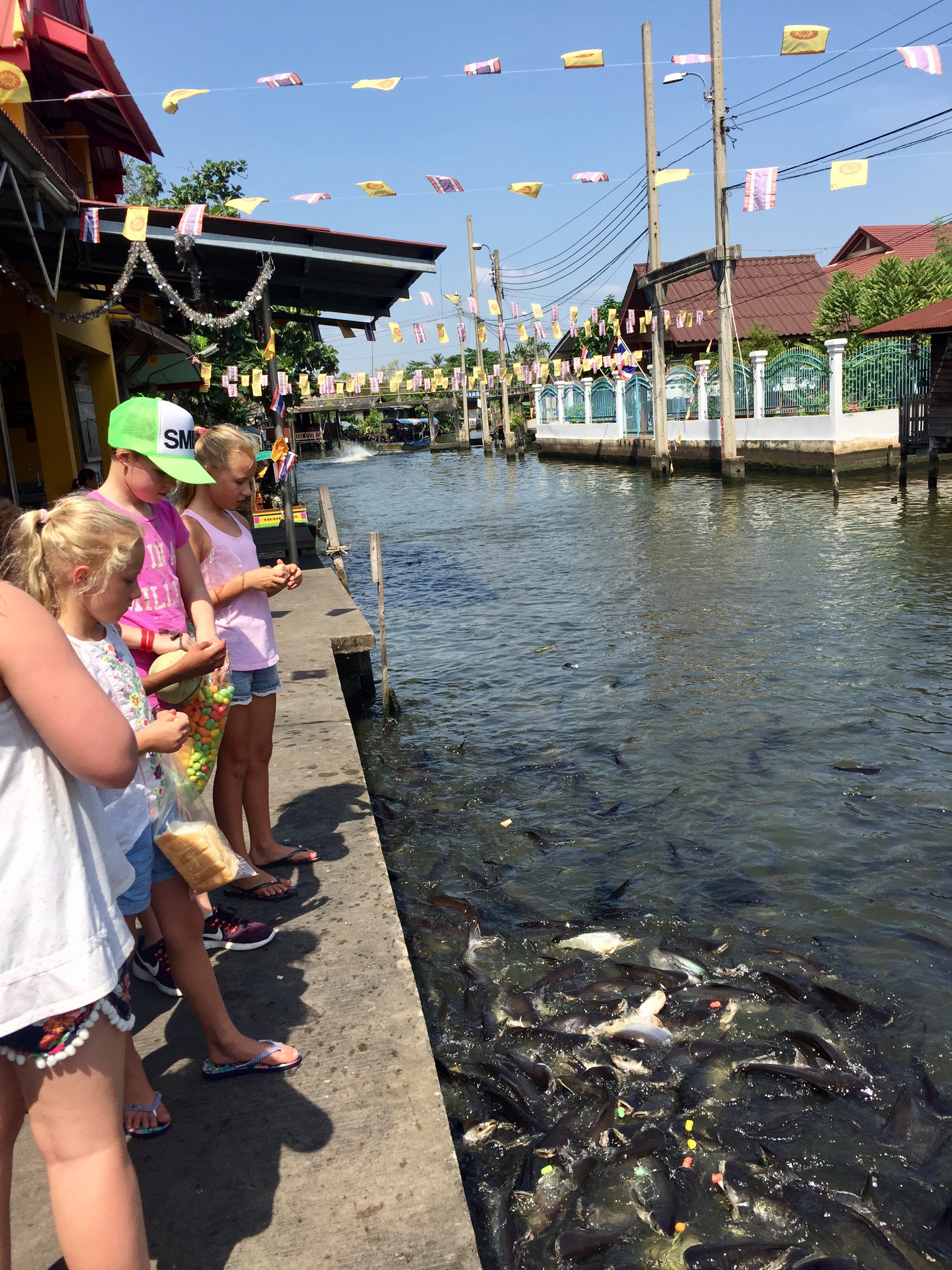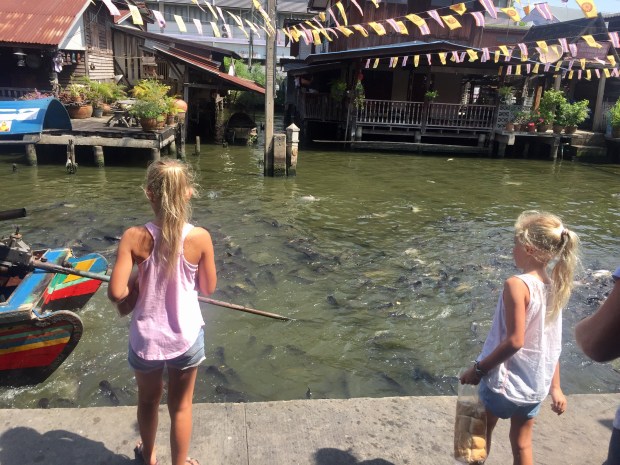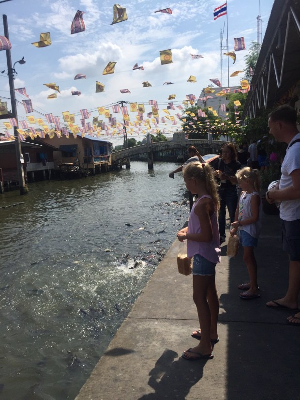 We stopped to visit the Wat Packnam temple with its beautiful painted ceilings and solid gold Buddhas, it was truly spectacular unfortunately the girls were feeling a little “templed out” and restless so Nadia suggested a popular activity for the Thai children, feeding the temple fish!