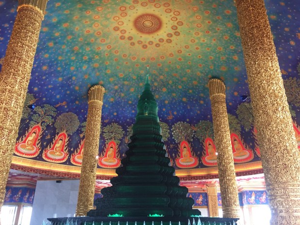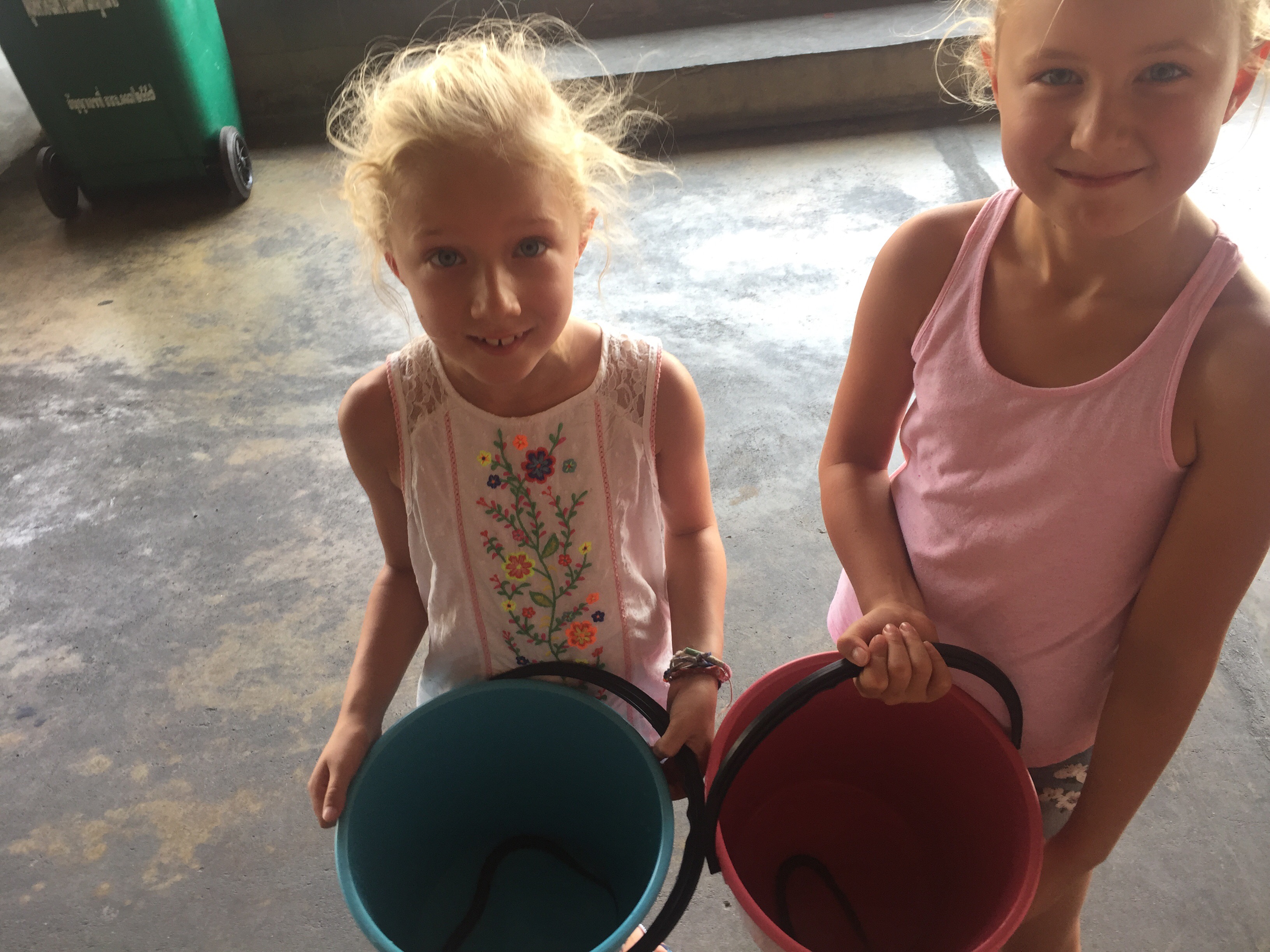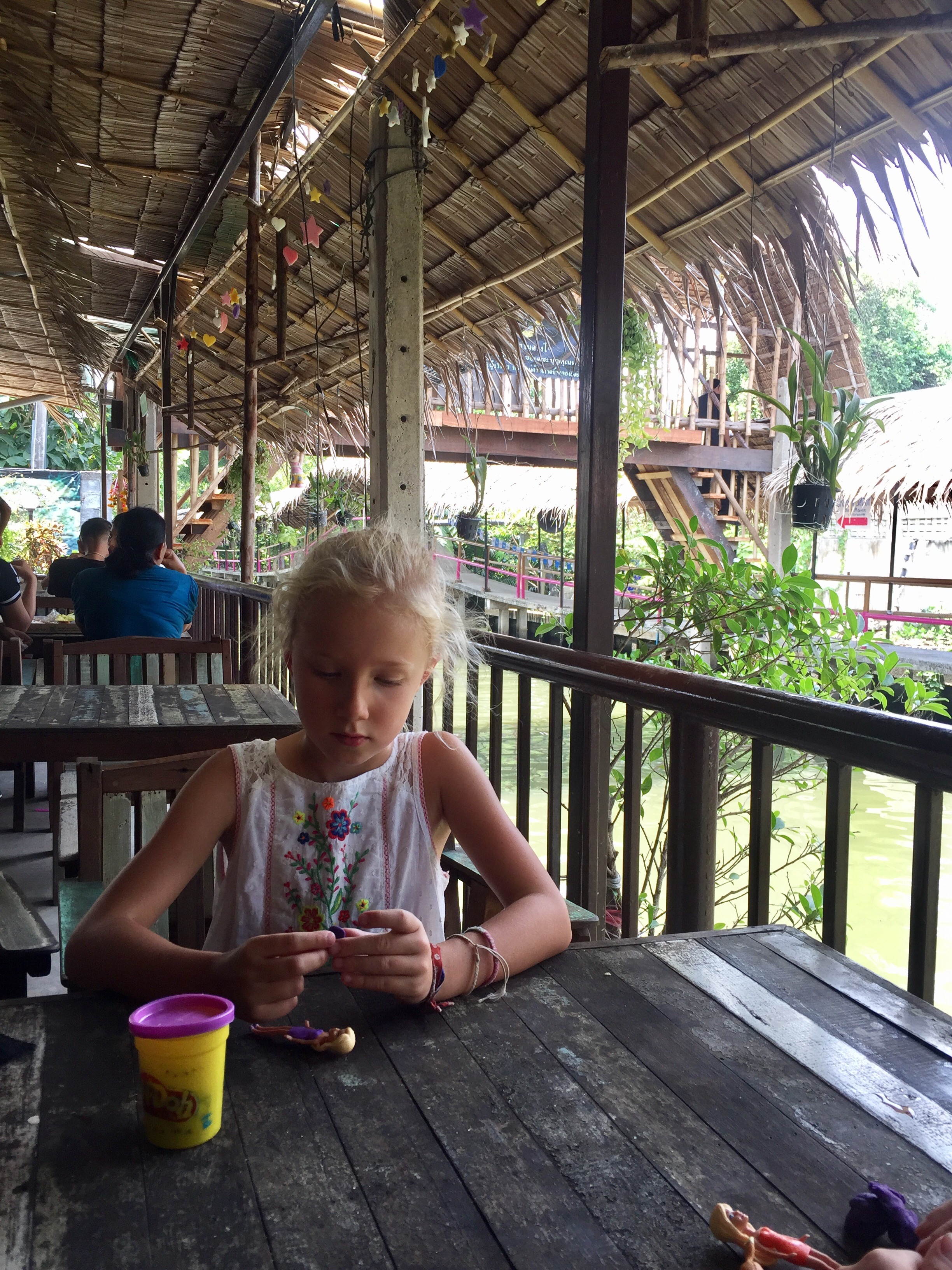 We stopped to visit the Wat Packnam temple with its beautiful painted ceilings and solid gold Buddhas, it was truly spectacular unfortunately the girls were feeling a little “templed out” and restless so Nadia suggested a popular activity for the Thai children, feeding the temple fish!