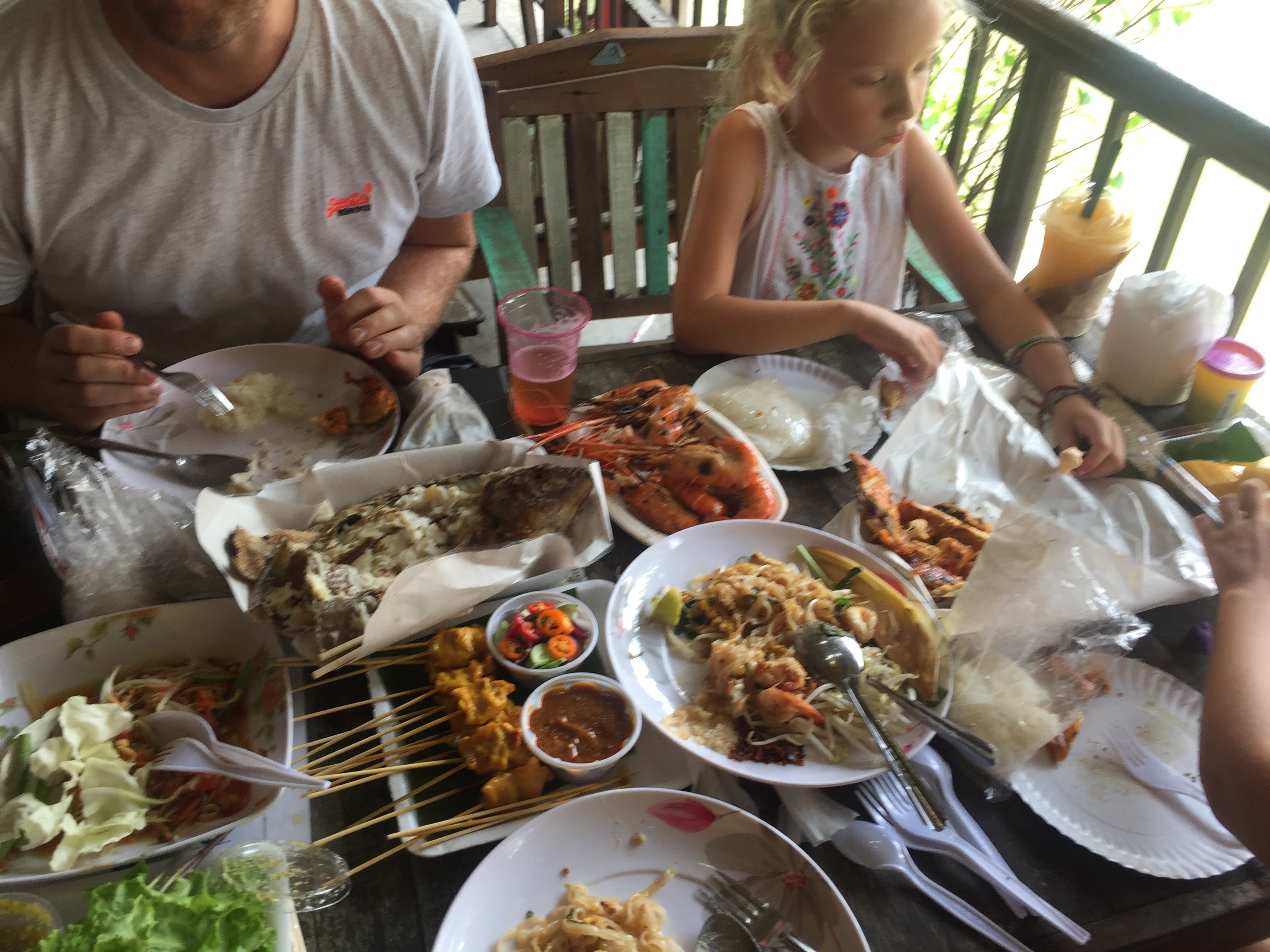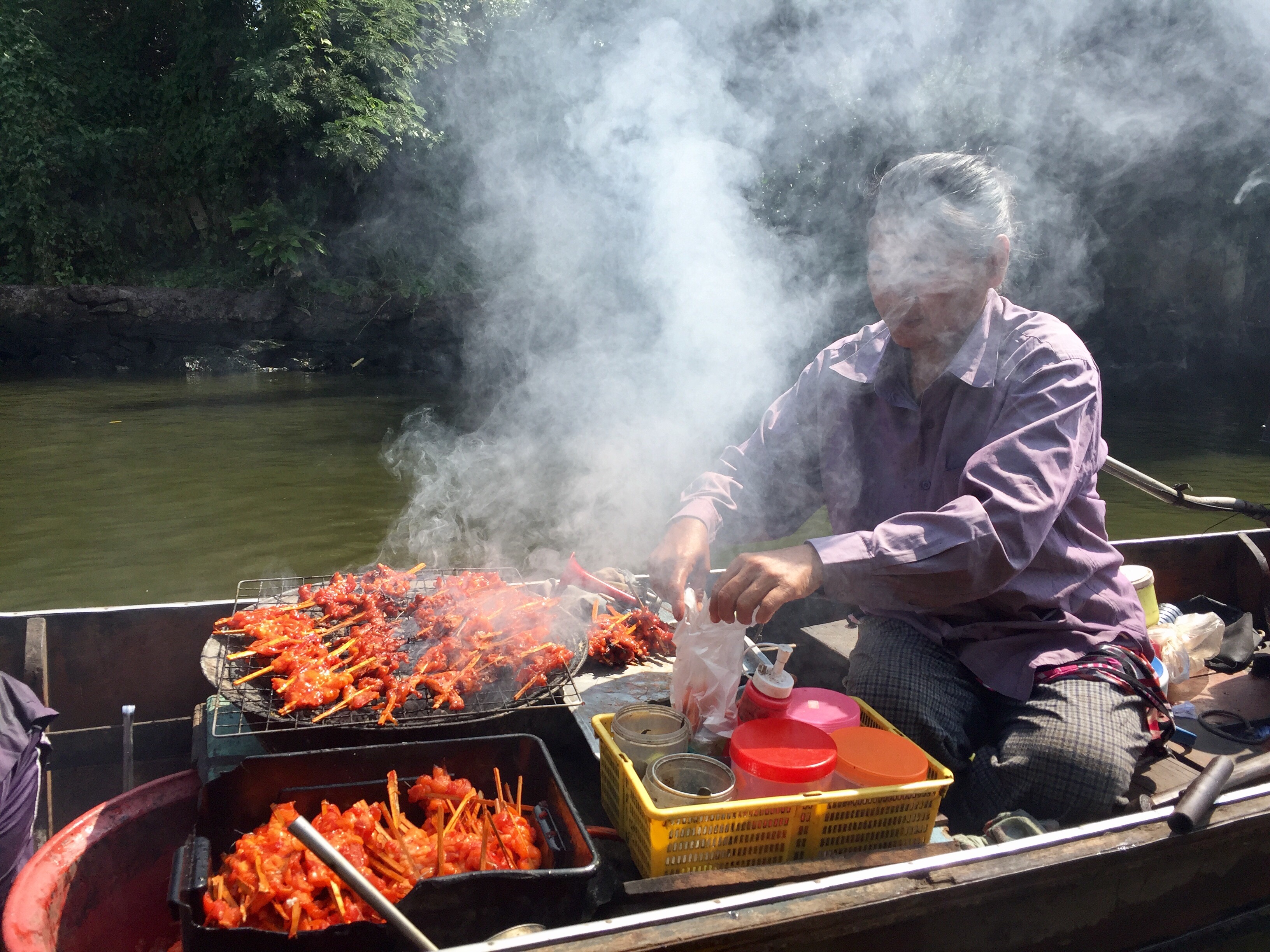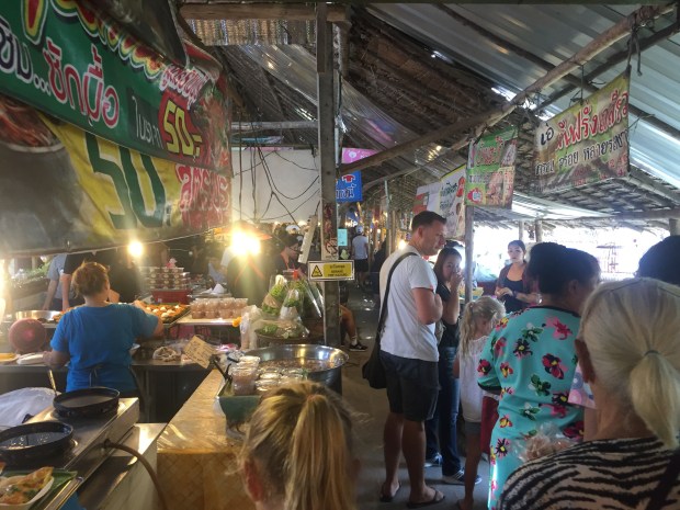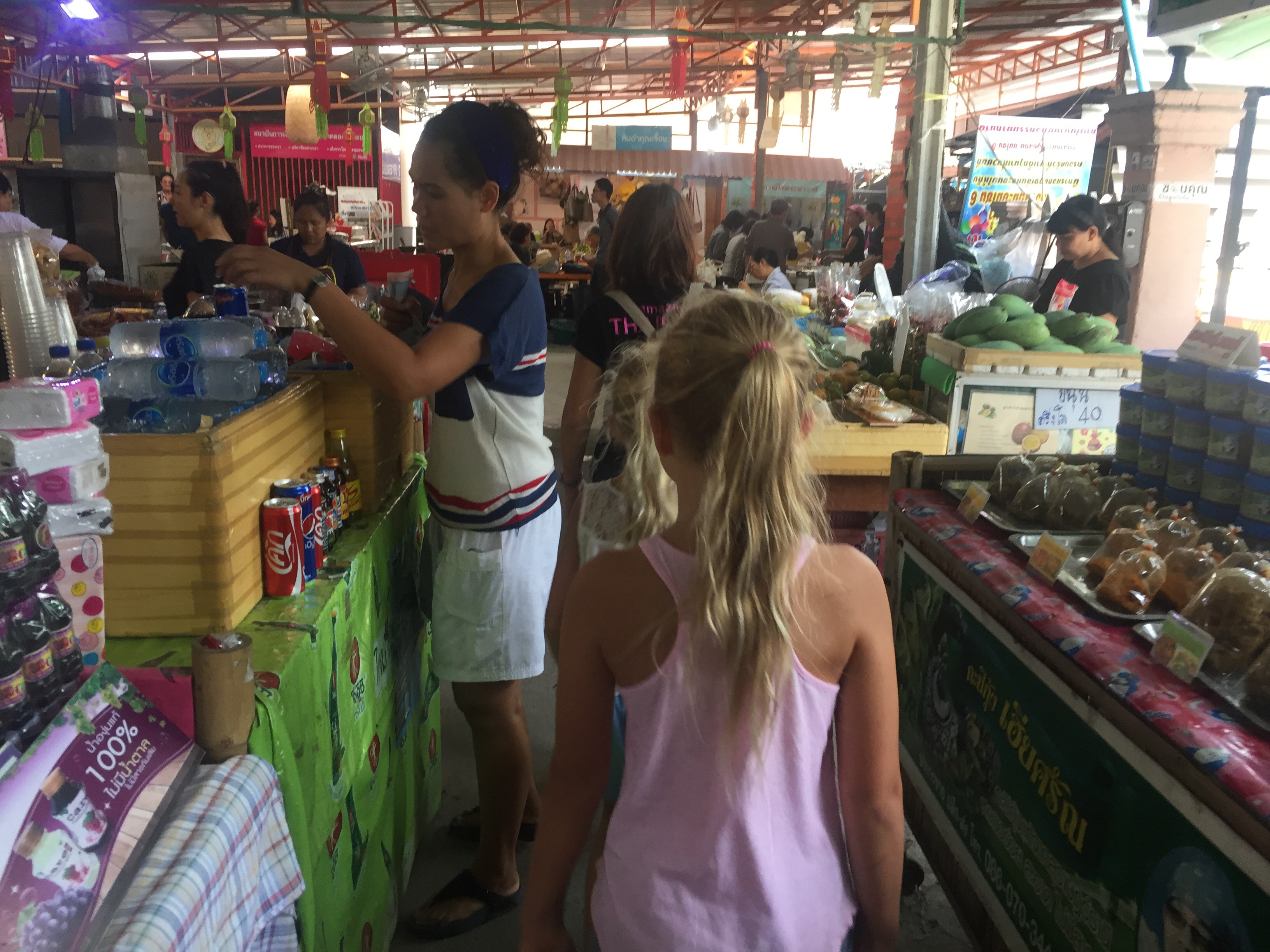 Afterwards we returned to our boat and set off to the floating market for lunch! Here Nadia took us from stall to stall explaining all the dishes and food on offer! So much more than pad Thai and green/red curries! The market was a feast of exotic flavours and aromas, and the variety was vast! Thankfully Nadia kindly picked out dishes for us, far too many, but it was amazing to try all these different freshly cooked flavours….and the girls got their favourite mango and sticky rice again! We left the maket with very full tummies!