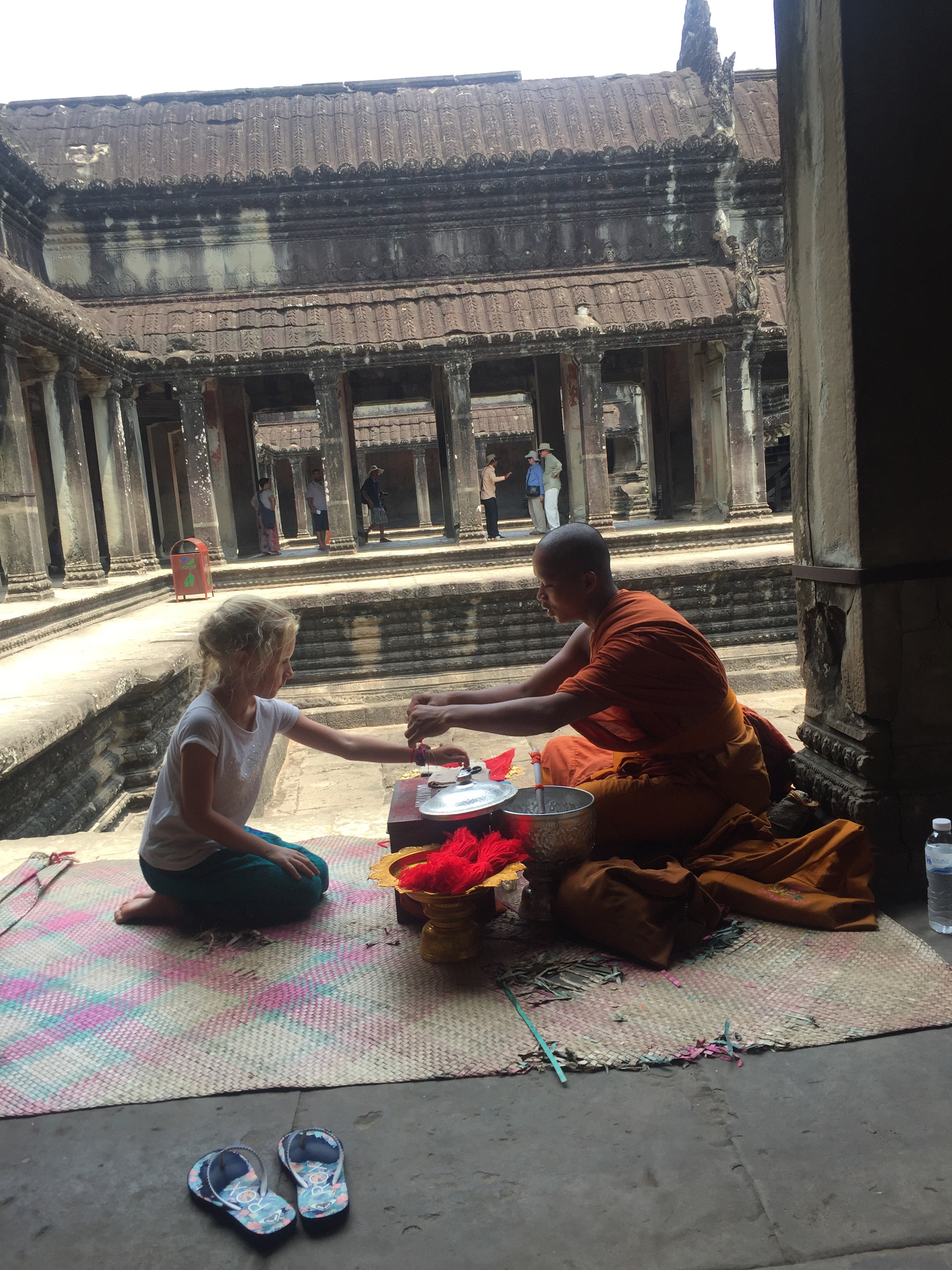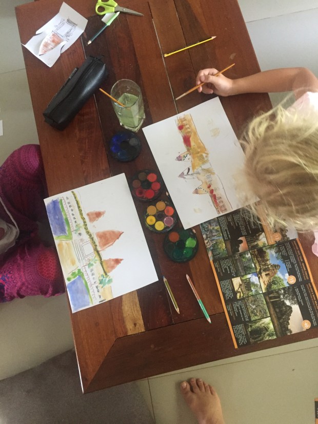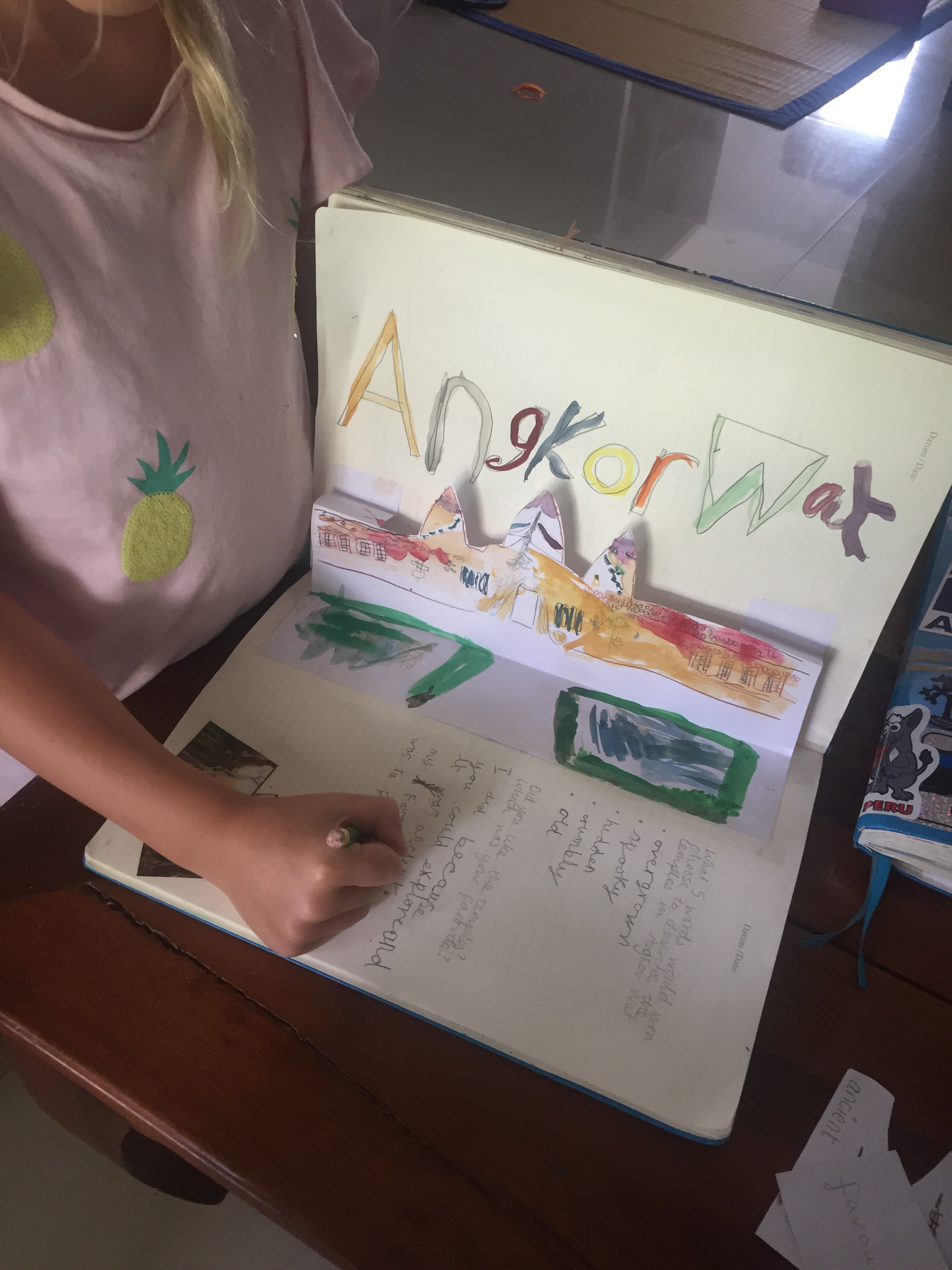 Today has been a sort of rest/schooling day, we got up late and after breakfast we did some maths, English and ‘pop up’ Angkor Wats for their journals! Turned out pretty well actually, pats on the back all round!